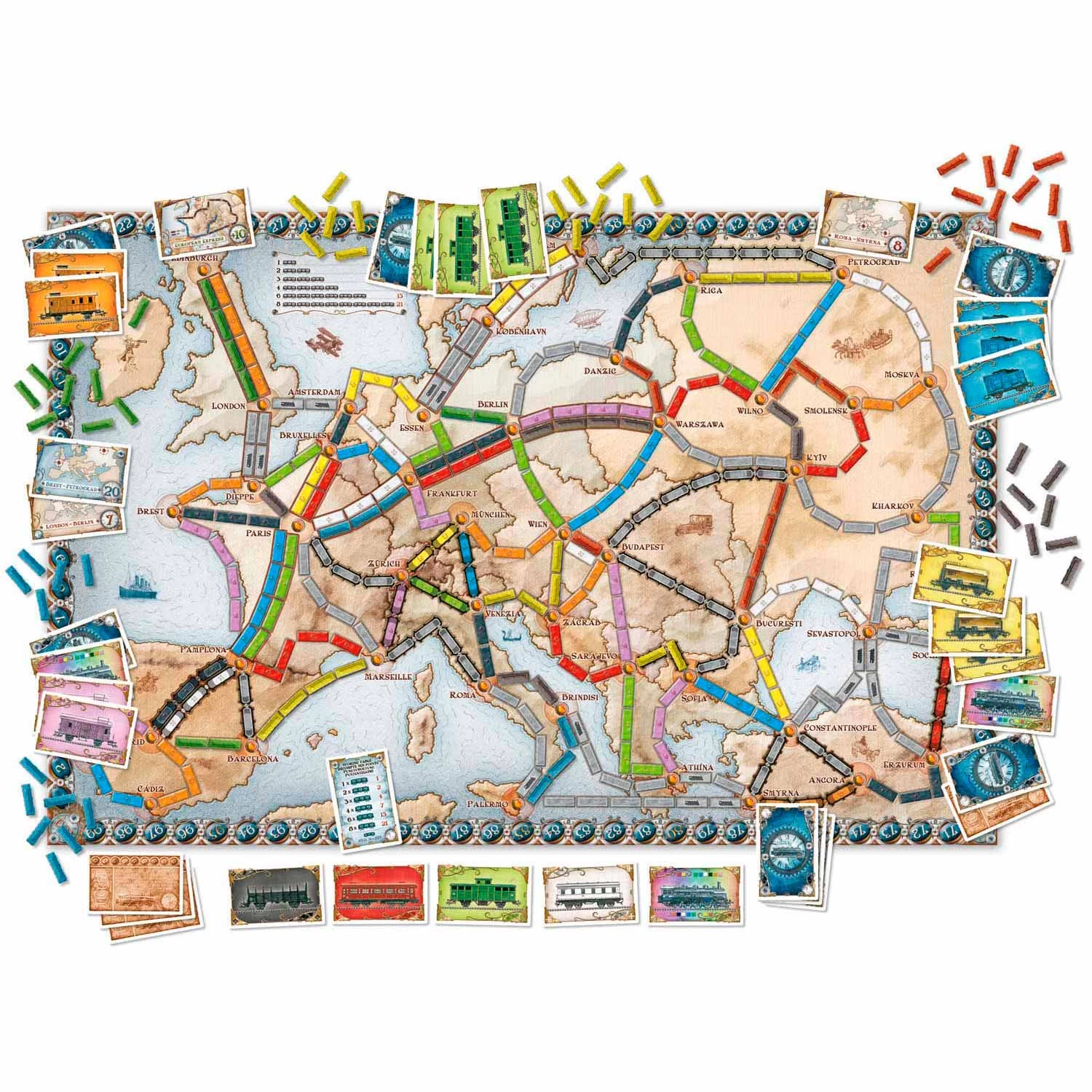 Het bordspel Ticket to Ride Europe neemt je mee op een nieuw treinavontuur door de grootste steden van Europa. Spelers proberen treinroutes op hun bestemmingskaarten te volbrengen.