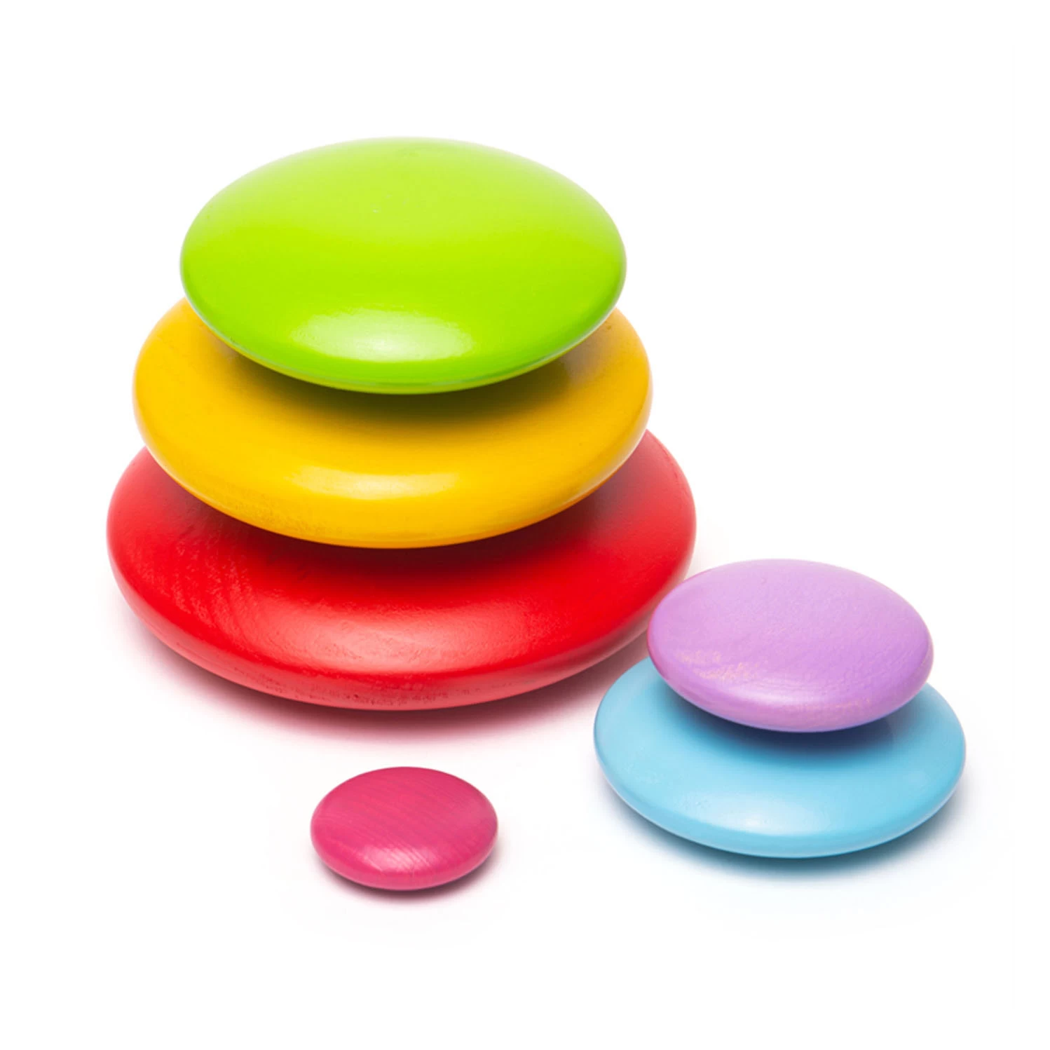 Stapel de gladde houten kiezelstenen voorzichtig op elkaar en zoek naar de balans voordat ze naar beneden vallen. Een eenvoudig maar leuk houten stapelspel, de speelmogelijkheden zijn eindeloos.