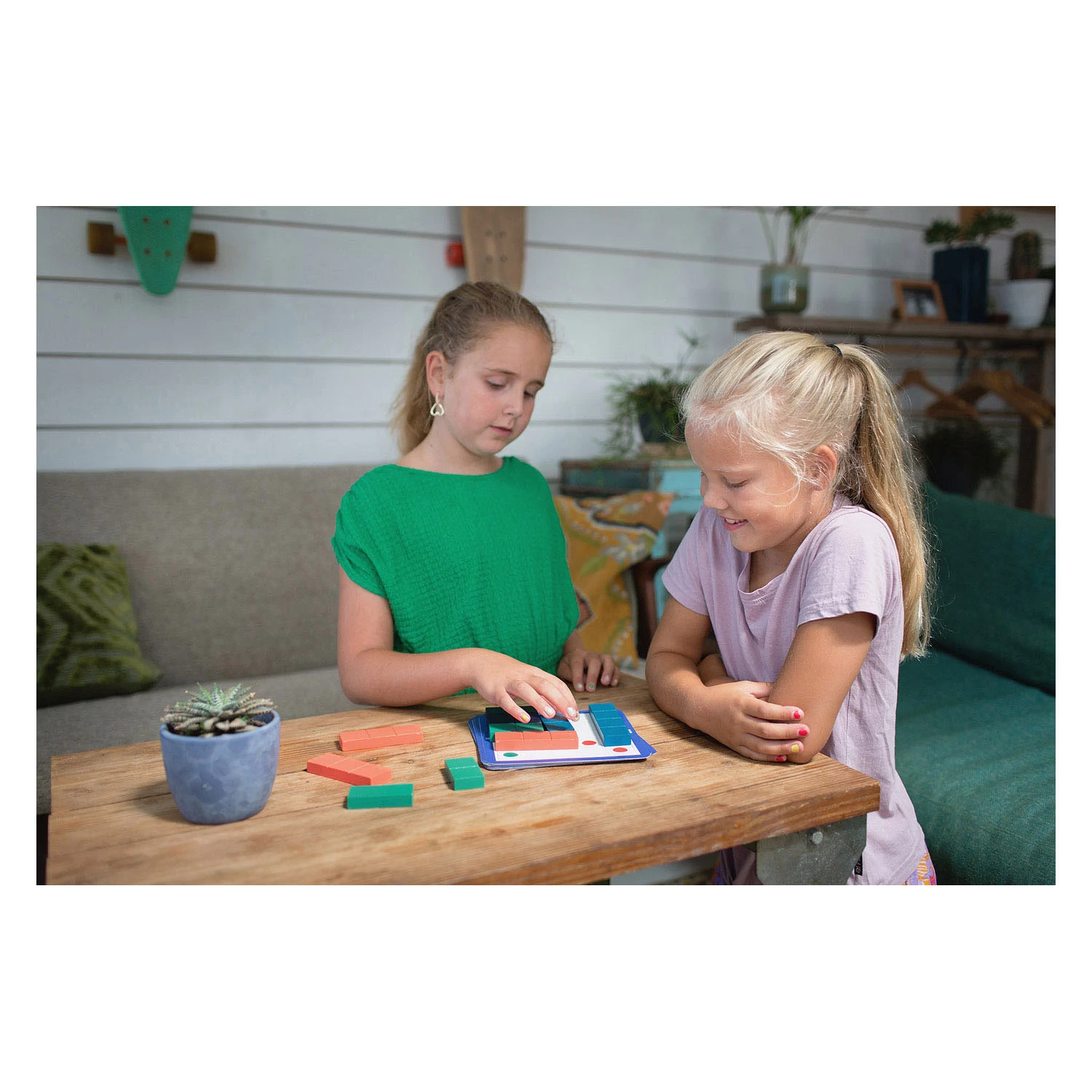 Kijk goed naar de kaart en leg de houten stukken op de juiste plek. De gekleurde stippen moeten overeenkomen met de kleur van het puzzelstuk wat daar ligt. De oplossingen staan in het bijgeleverde boekje, maar niet stiekem spieken!