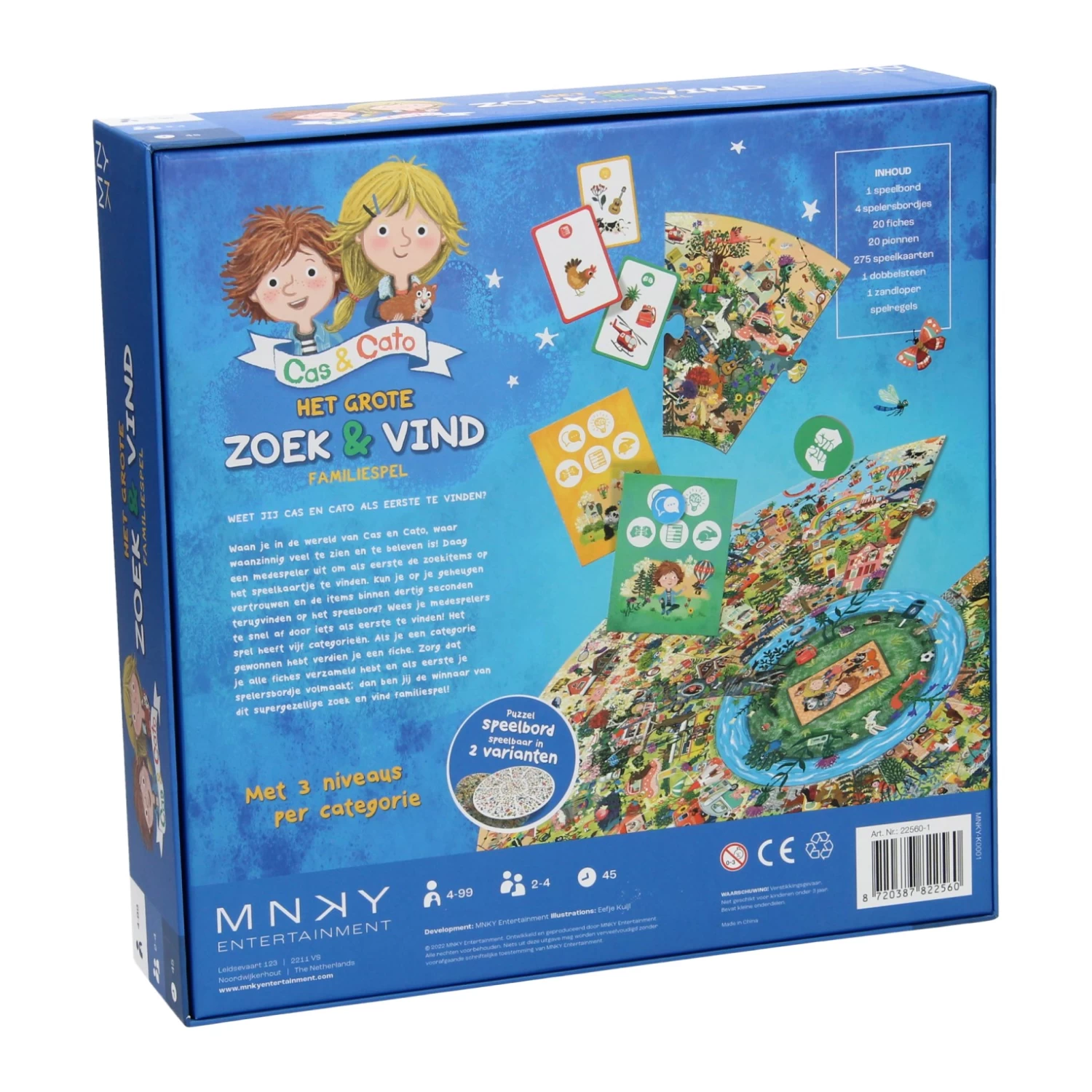 Waan je in de wereld van Cas en Cato, waar waanzinnig veel te zien en te beleven is! Daag een medespeler uit om als eerste de zoekitems het speelkaartje te vinden. Kun je op je geheugen vertrouwen en de items binnen dertig seconden terugvinden op het speelbord? Wees je medespelers te snel af door iets als eerste te vinden! Het spel heeft vijf categorieën. Als je een categorie gewonnen hebt verdien je een fiche. Zorg dat je alle fiches verzameld hebt en als eerste je spelersbordje volmaakt: dan ben jij de winnaar van dit supergezellig zoek-en-vind familiespel!