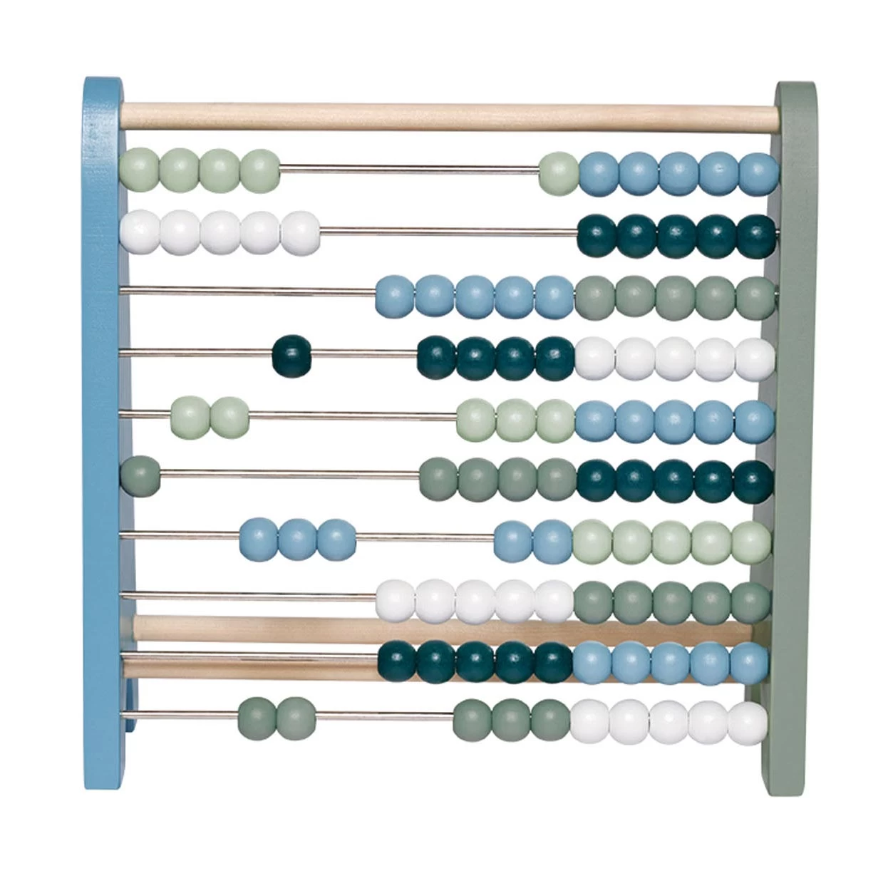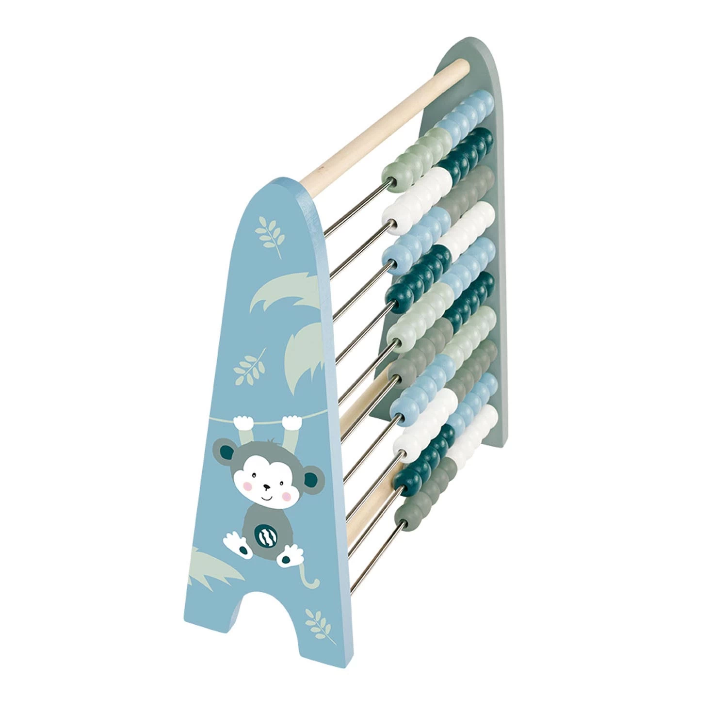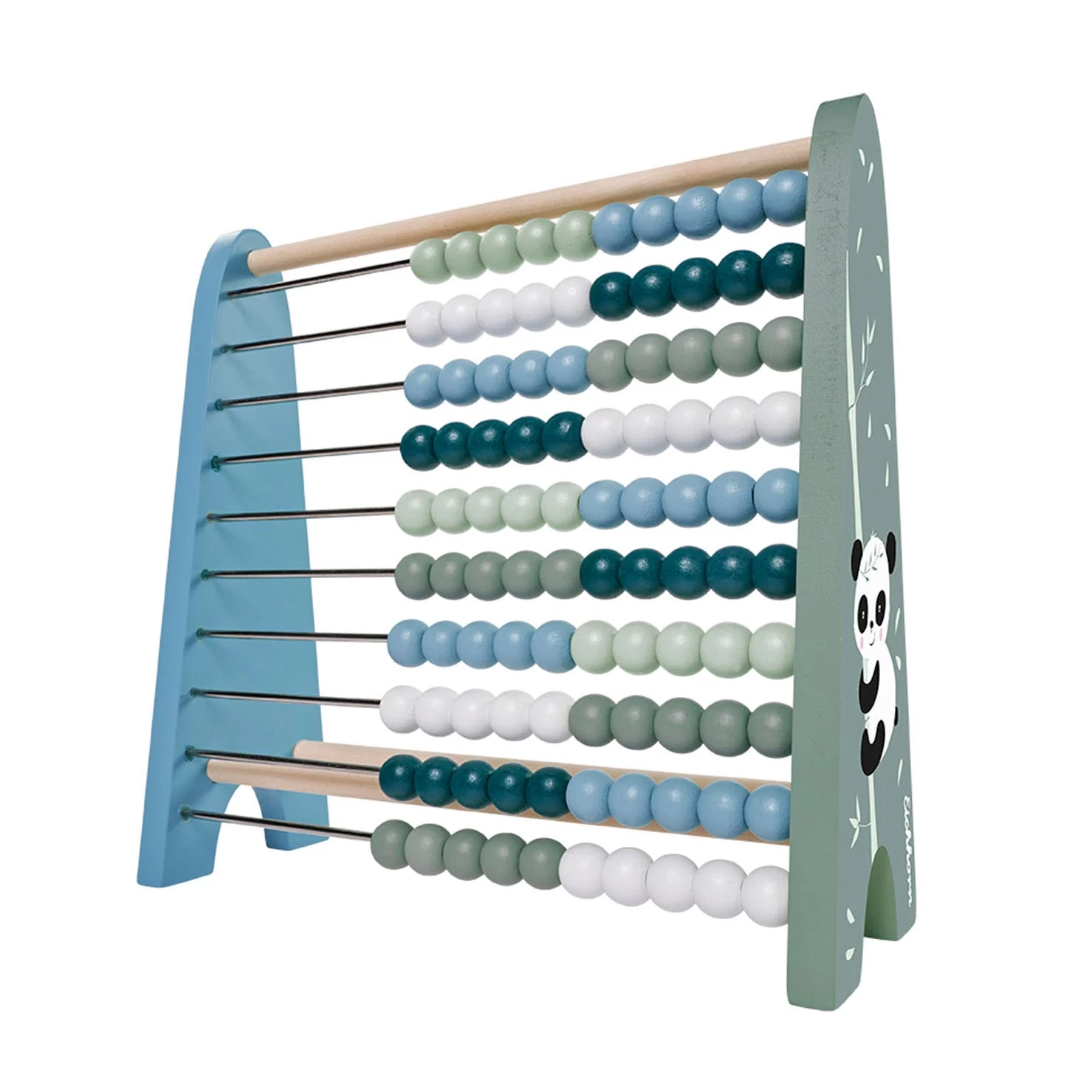 Leer tellen met dit houten telraam! Het telraam is grijs met blauwe en witte accenten en heeft een afbeelding van een panda op de ene zijkant en aan de andere kant een afbeelding van een aapje. Met 100 houten ballen in 4 verschillende kleuren kun je de basis van het optellen en aftrekken leren. Voor de kleuring zijn alleen ongevaarlijke kleuren op waterbasis gebruikt. Het telraam heeft een afmeting van 24 bij 23 bij 8,5 cm. Geschikt voor kinderen van 3 tot 6 jaar oud.