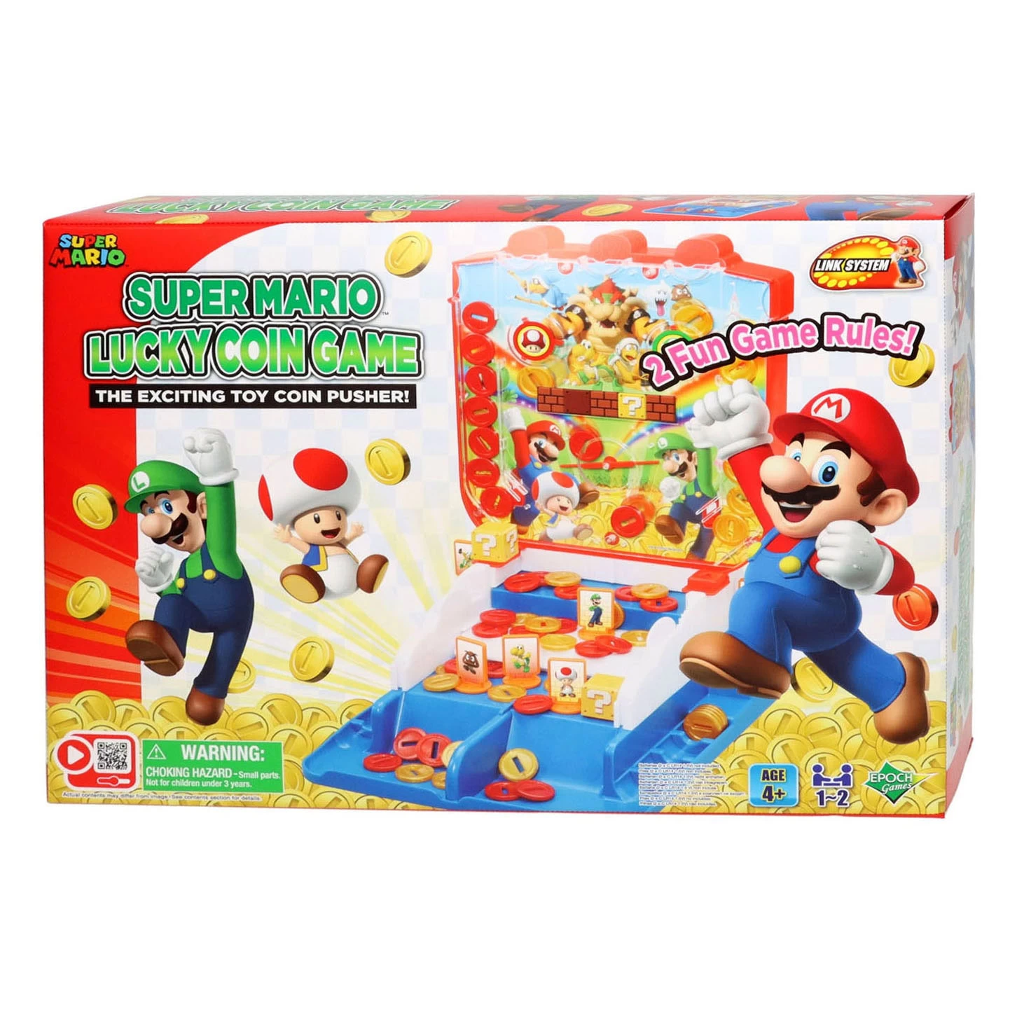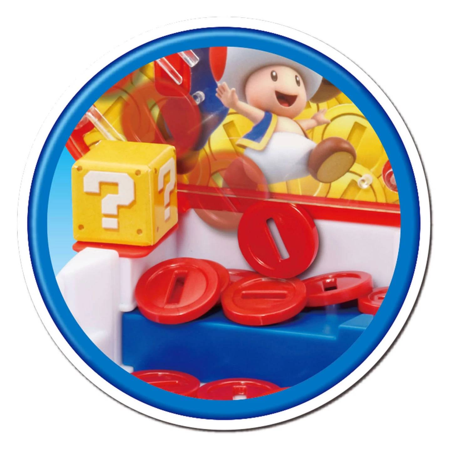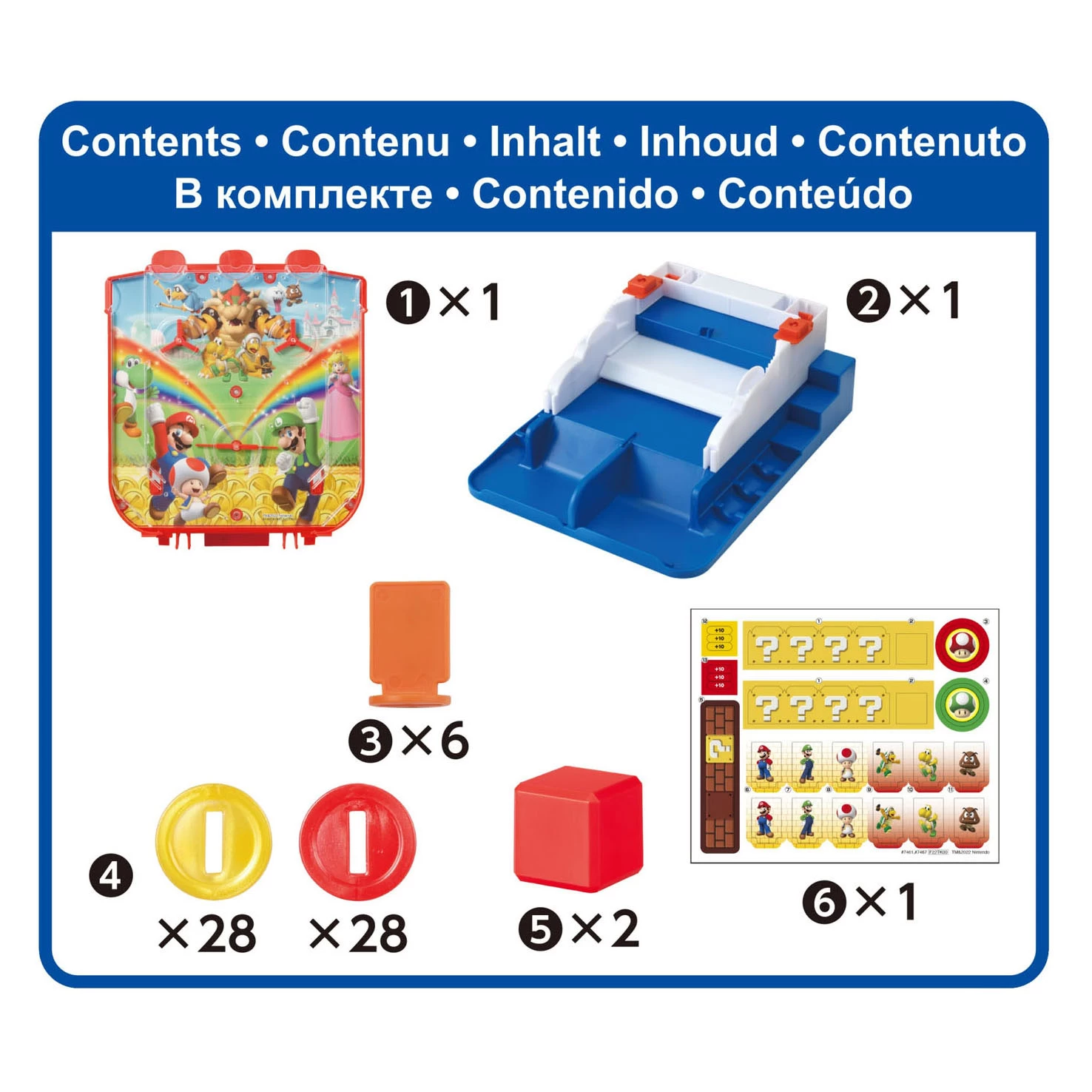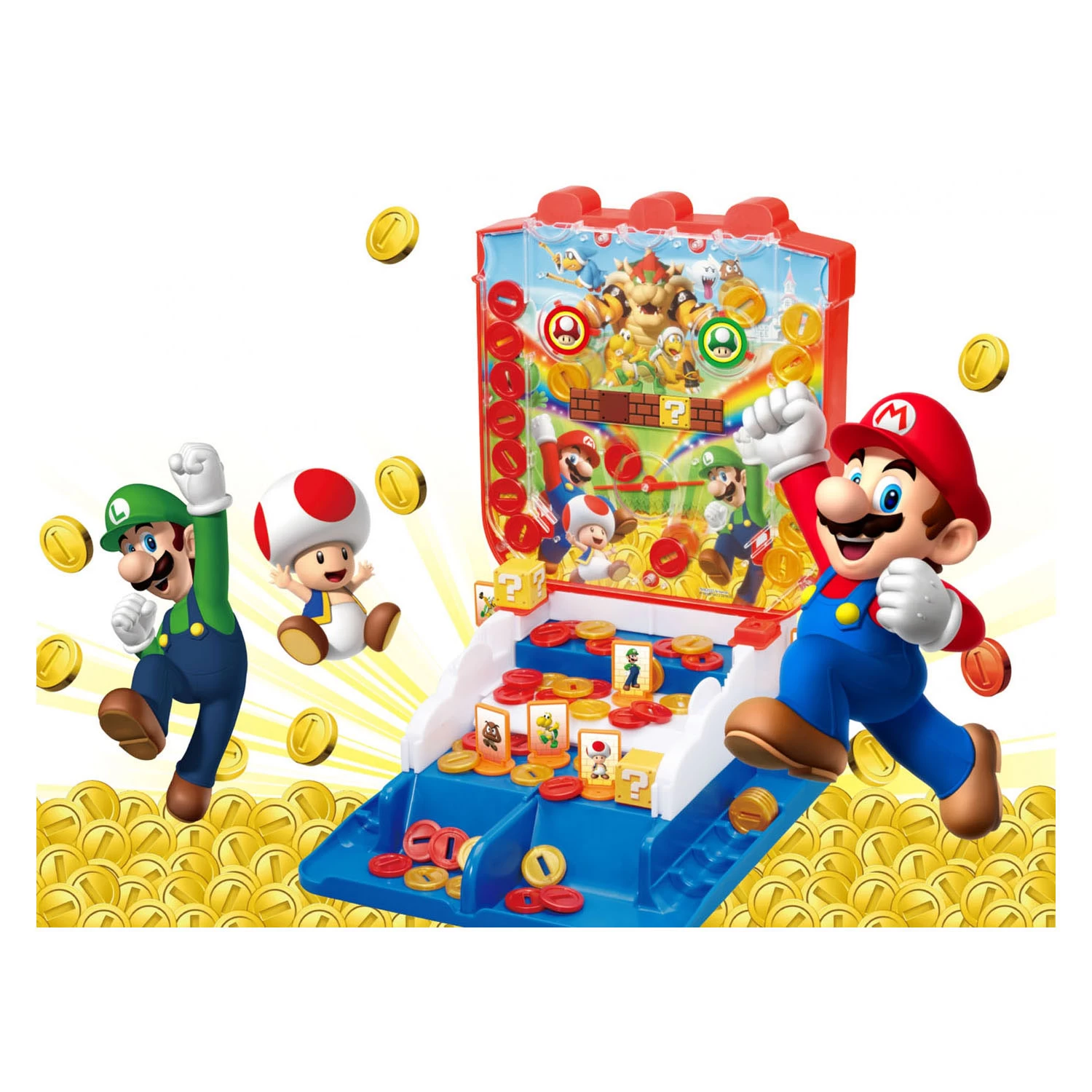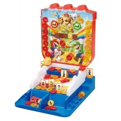 Lukt het jou om de meeste munten te winnen met het gelukspel van Mario? Het lijkt net een kwartjesautomaat! Het doel is om de munten en figuren aan jouw kant van het bakje te vangen. Hoe meer, hoe beter. De set bestaat uit rode en gele munten, de speltafel, figuren en fiches. Alles wat je nodig voor een fanatiek wedstrijdje geld winnen.