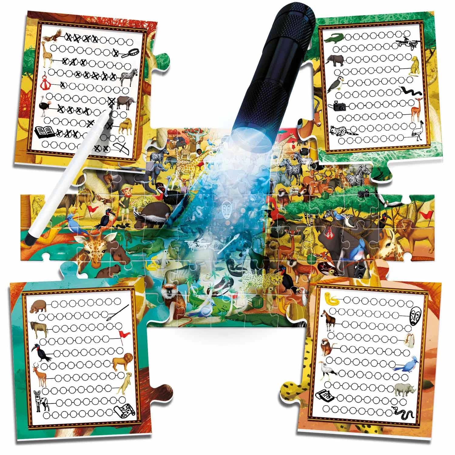 Monteer de puzzel, observeer de illustratie voorzichtig en ontdek de onderwerpen in de savanne. Net als een echte wetenschapper, noteer de individuele ontdekkingen op je wissen van kaarten. Bovendien, door gebruik te maken van de “Magic Light Torch”, kunt u ook observeren wat niet door het blote oog kan worden gezien. Inhoud: 70 puzzelstukken, pen uitwisbaar, uv zaklamp (werkt op 3 AAA batterijen, niet inbegrepen) Inclusief overzichtelijke handleiding in de volgende talen: Engels, Italiaans, Frans, Spaans, Duits en Portugees. Let op! Het artikel bevat geen Nederlandse handleiding. .