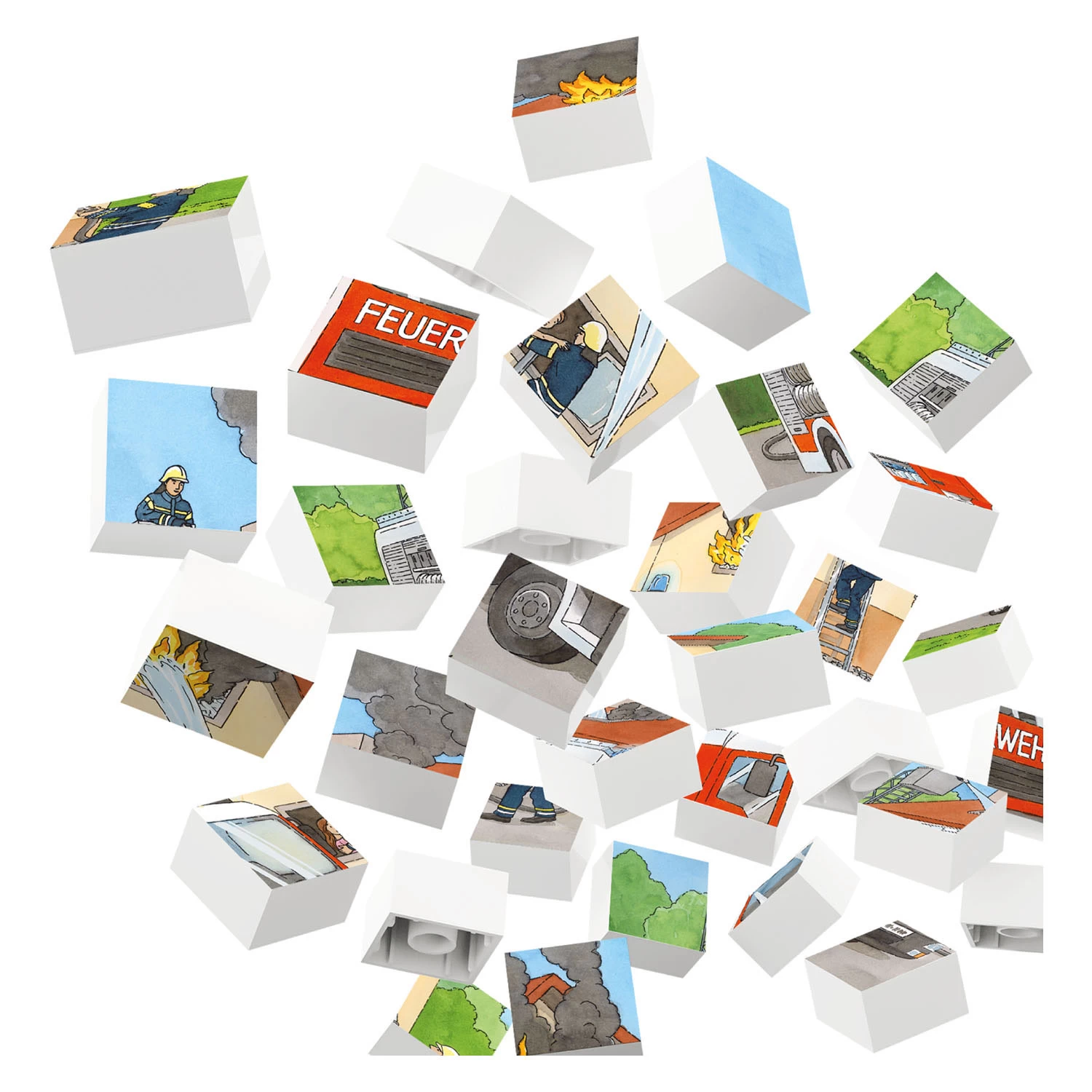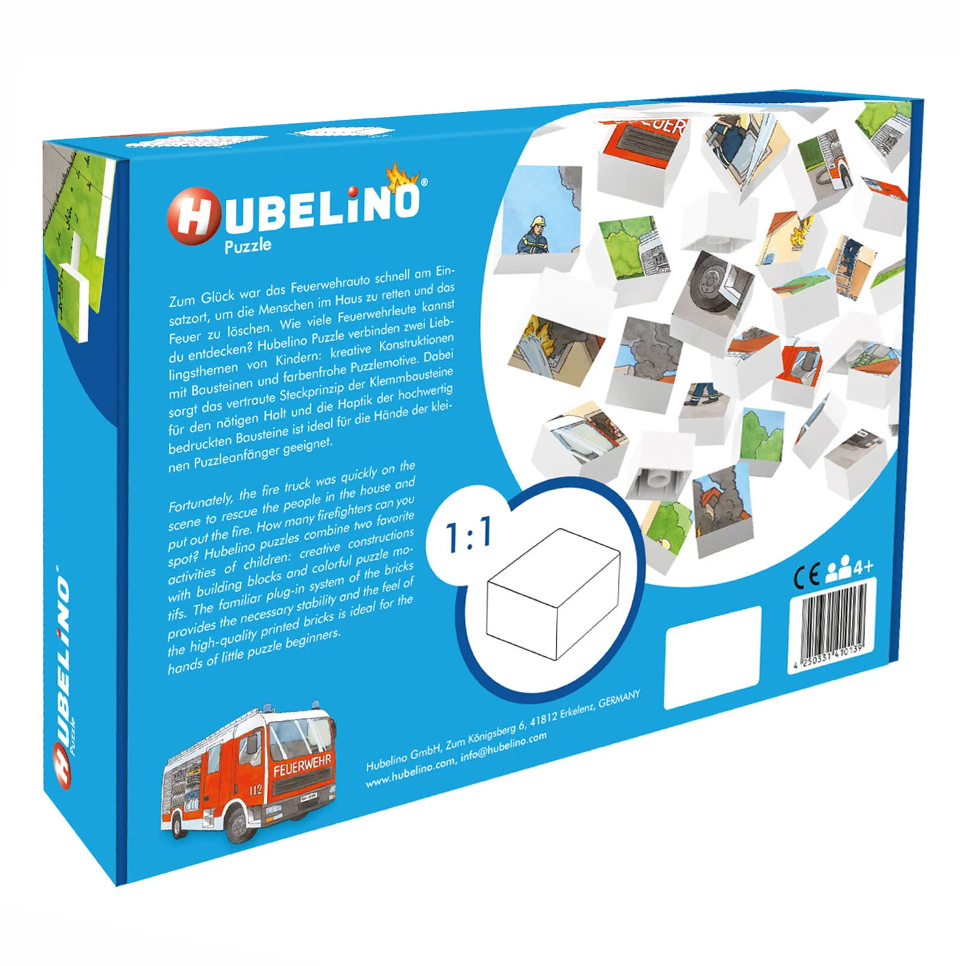 Gelukkig was de brandweer snel ter plaatse om de inzittenden te redden en het vuur te blussen. Hoeveel brandweerlieden kun jij spotten? Hubelino-puzzels combineren twee favoriete activiteiten van kinderen: creatieve constructies met bouwstenen en kleurrijke puzzelmotieven. Het vertrouwde insteeksysteem van de stenen zorgt voor de nodige stabiliteit en het gevoel van de hoogwaardig bedrukte stenen is ideaal voor de handjes van kleine puzzelbeginners.