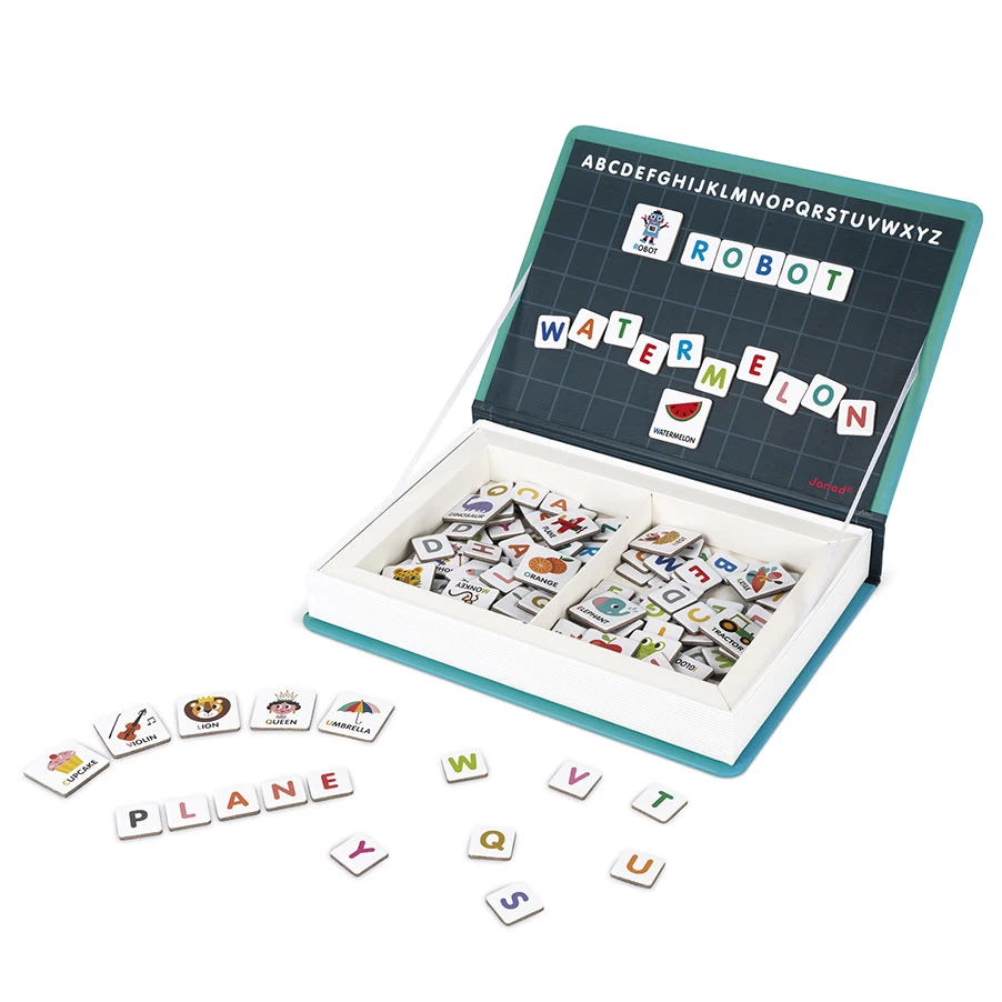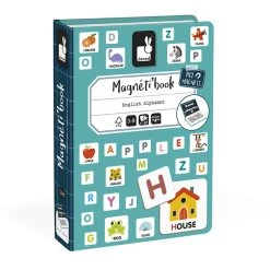 Educatief magneetspel van karton om het Engelse alfabet te leren. Bevat 26 afbeeldingsmagneten en 116 lettermagneten. Open het boek en leg op de juiste manier het woord dat op elke afbeeldingsmagneet is aangegeven.