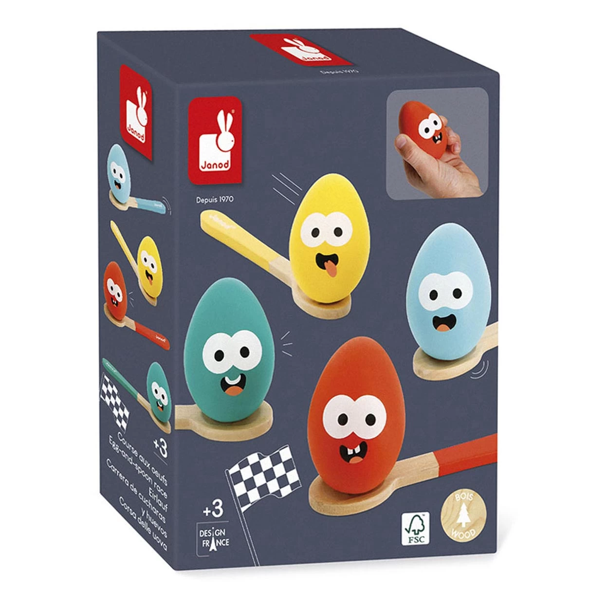 Maak je klaar voor een wilde race, de eieren breken is verboden! Iedereen aan de startlijn met de lepel in de hand, 3�?�2�?�1�?�start! Deze set bestaat uit 4 lepels en 4 gekleurde eieren van hout. Ideaal voor op een verjaardag of speelmiddag. Spel van FSC-gecertificeerd hout en waterverf. Voor kinderen vanaf 3 jaar.