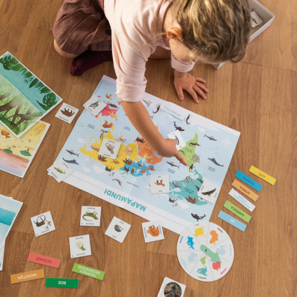 Leer spelenderwijs de dierenwereld kennen. het spel bevat veel intutief materiaal dat aansluit bij het Montessori,- Waldorf- en Freinetonderwijs, waarmee meer dan 20 spelletjes gespeeld kunnen worden. Door op een spontane manier met het materiaal te experimenteren leren kinderen de dieren van de wereld kennen door middel van hun kenmerken en in welke leefomgevingen en werelddelen ze voorkomen. Inhoud: 80 dubbelzijdige dierkaarten 4 soortkaarten (zoogdieren, vogels, vissen en reptielen) 6 grote dubbelzijdige werelddeel- en habitatkaarten 1 draaischijf met pijl en clipje 7 naamkaartjes van de werelddelen 1 wereldkaart en overzichtsposter 1 handleiding met 20+ spelletjes en oefeningen.
