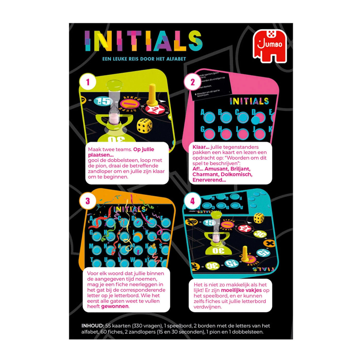 Test je woordenschat met het nieuwe partyspel Initials, van de makers van Party en Co! In dit spannende gezelschapsspel voor volwassenen en kinderen moet je zoveel mogelijk woorden bedenken met de verschillende letters van het alfabet om een fiche te winnen en het letterbord van jouw team te vullen. Maar wees snel! Elke ronde duurt maar 15 of 30 seconde, voor je het weet is je beurt weer voorbij! Daarnaast kan het andere team letters stelen en blokkades opleggen, waardoor de strijd spannend blijft tot de laatste letter!