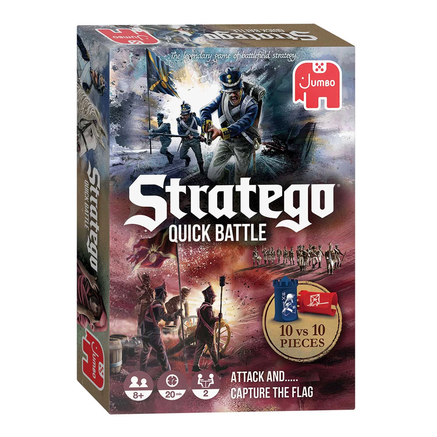 Een snelle, efficiënte veldslag: die organiseer je met Stratego Quick Battle! Met een klein leger blauwe of rode soldaten ga je strijd aan. Stratego Quick Battle is een verkorte spelversie van het klassieke Stratego-spel en is te spelen als Barrage en Duel. Je speelt beiden met 10 speelstukken. Het spelbord is magnetisch, wat het spel ideaal maakt om bijvoorbeeld mee te nemen op vakantie.