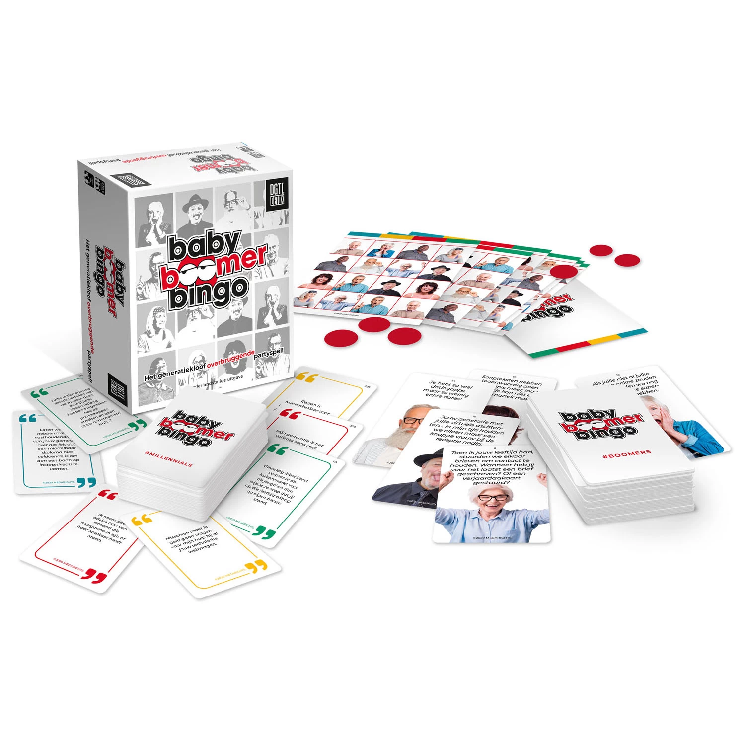 Bonus: tegelijkertijd speel je ook nog eens bingo! Iedere speler krijgt 1 bingokaart en 4 millennialkaarten welke hij moet combineren met de boomerkaart die per spelronde wordt voorgelezen.
