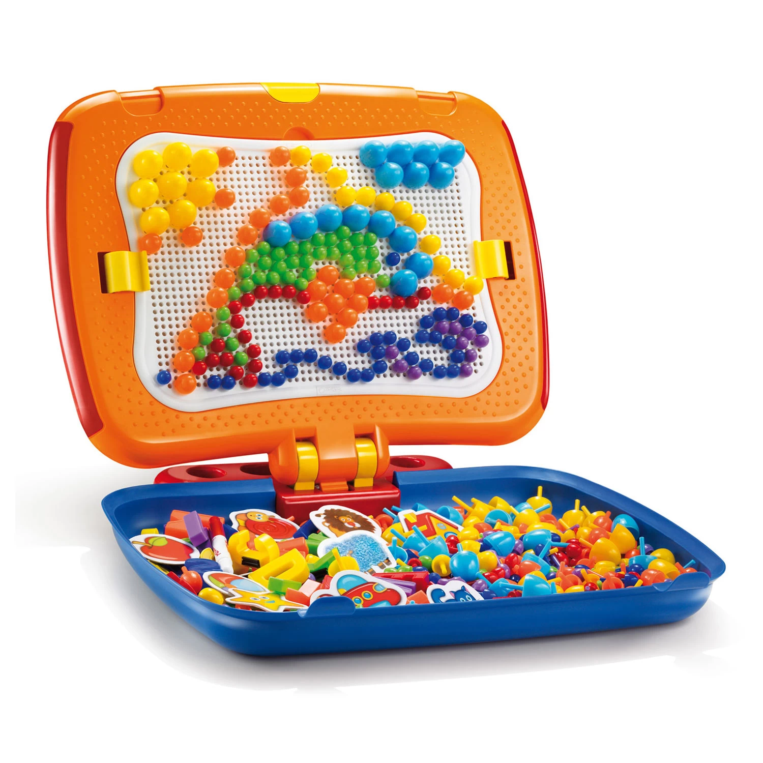 Maak de leukste creaties met dit Quercetti Combi insteekmozaïek en magneetbord. Deze 2-in-1 klassieker heeft een insteekmozaïek waarin je met pinnen kleurrijke motieven maakt. Aan de andere zijde vind je een schrijfbord waarop je met een speciale marker of de magneetletters je eerste woorden opschrijft. Het bord is flexibel op te stellen en speciaal ontworpen voor kinderen vanaf 3 jaar. In de set vind je 360 gekleurde pinnen, 48 magnetische letters en 12 magnetische afbeeldingen. Na het spelen berg je de spulletjes gemakkelijk op in de handige draagkoffer.