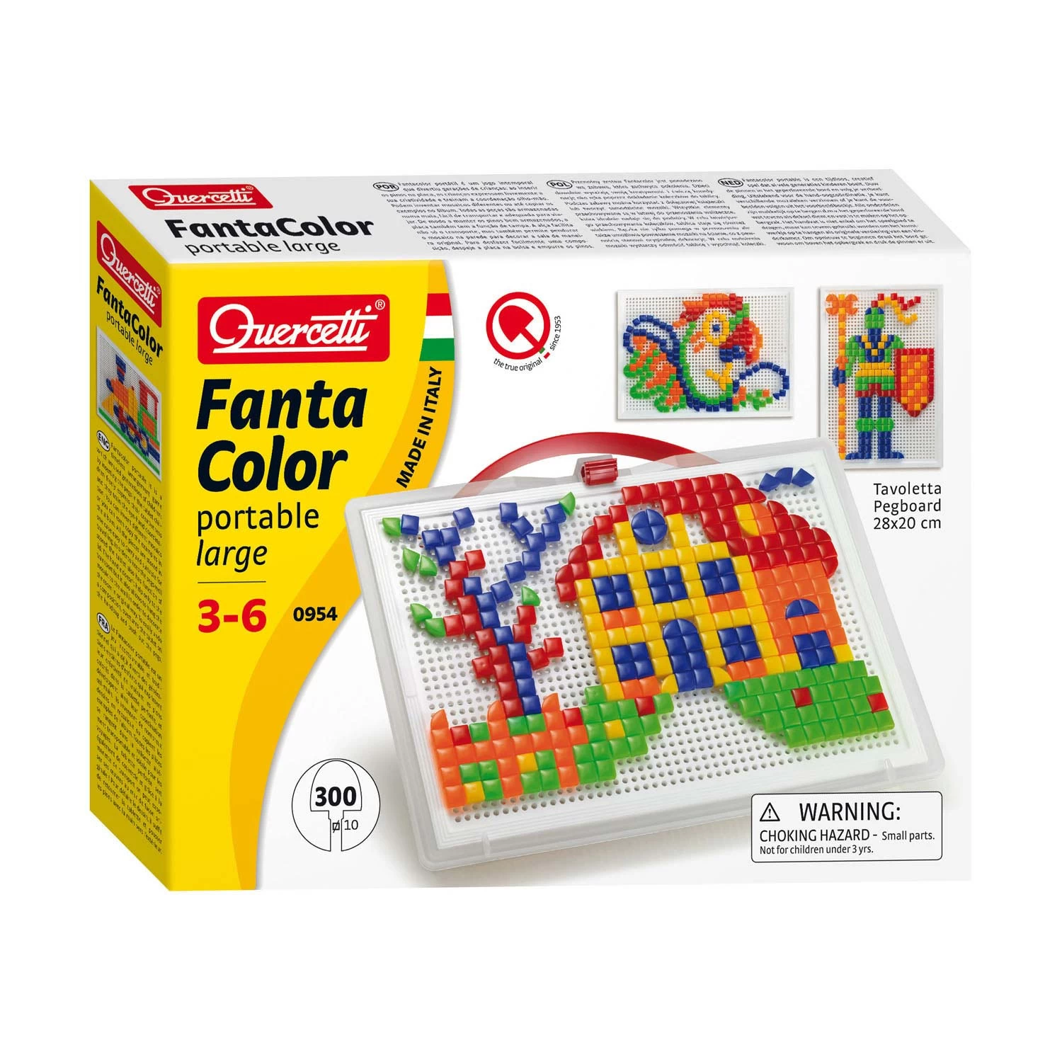 Quercetti Insteek Mozaïek met 300 pinnen. Het mozaïek bord is 20 bij 28 centimeter. Na het spelen kunnen de pinnen in de handige opbergkoffer worden opgeslagen. De pinnen hebben vijf verschillende kleuren en een lengte van 10 millimeter. Geschikt voor kinderen vanaf 3 jaar. oorbeeldboekje niet inbegrepen maar wel digitaal te downloaden. De instructies om voorbeelden te downloaden zit in de set.