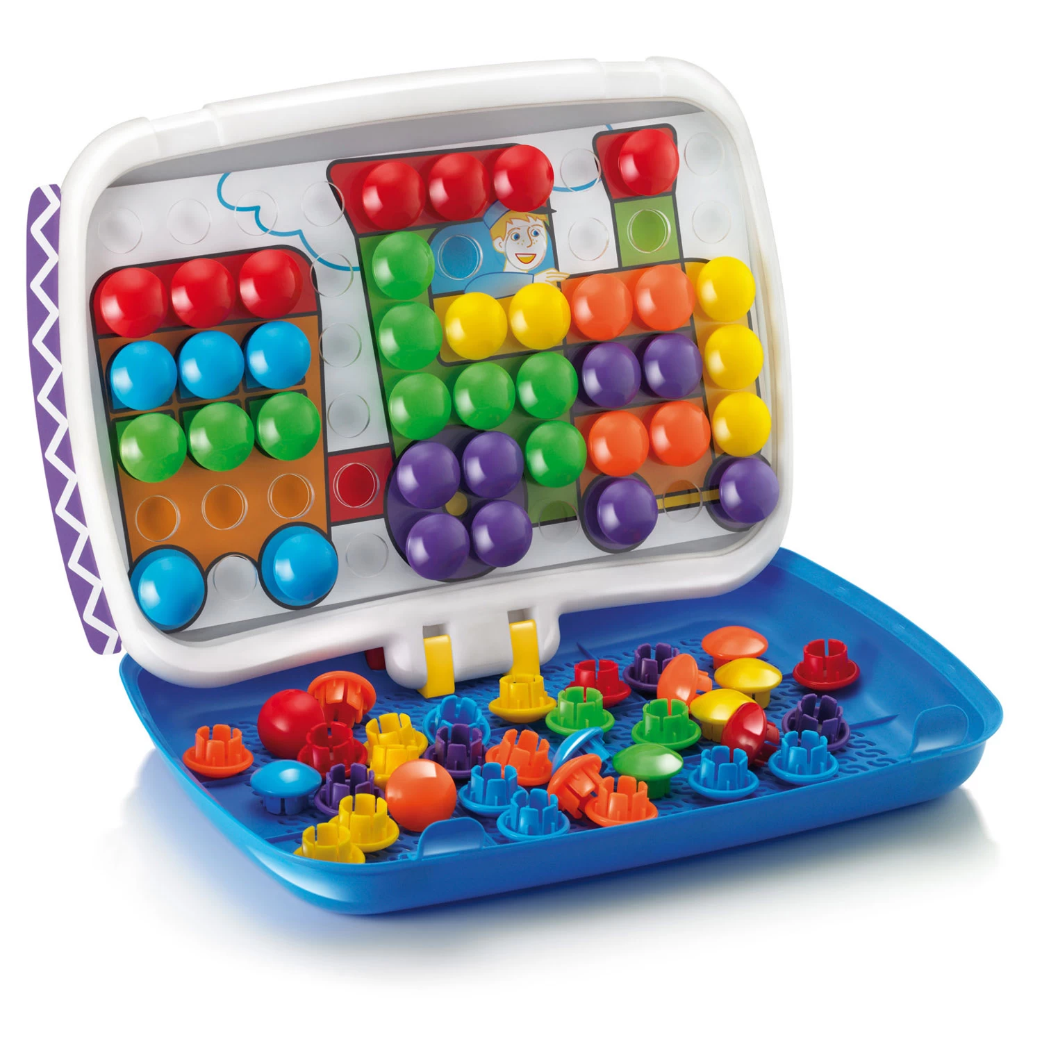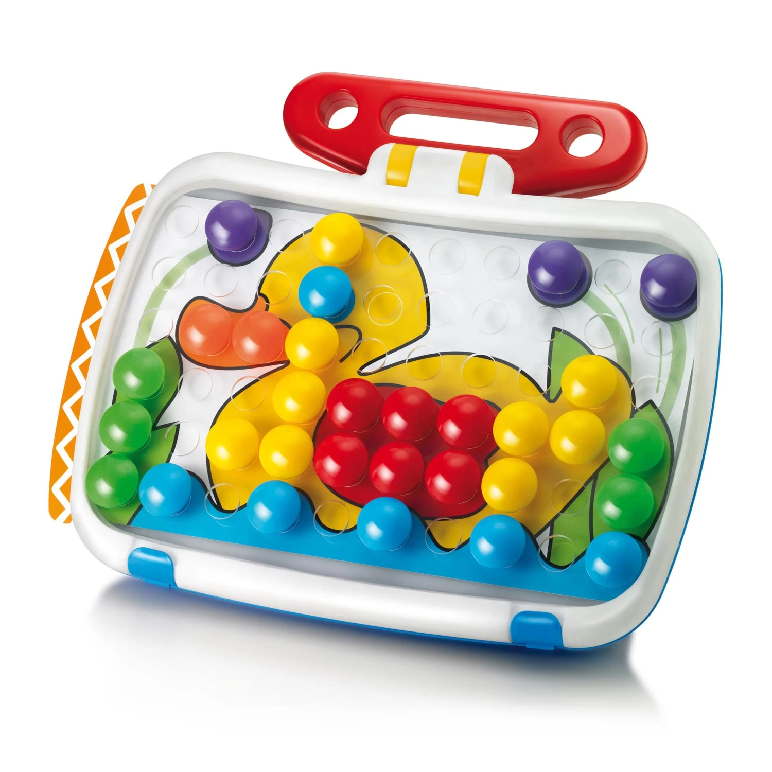 Deze Quercetti Combi Junior set is een combinatie van de twee best verkopende “classics” van Quercetti in een multifunctionele draagdoos. De ene kant is een bord om knoppen in te steken en kleurrijke motieven te maken. De andere kant is een (uitwisbaar) tekenbord waarop kinderen kunnen tekenen. Een design zonder scherpe hoeken waar kinderen vanaf 3 jaar veilig mee kunnen spelen. Het bord kan zonder moeite omhoog, omlaag en/of gedraaid worden. Alle onderdelen kunnen erin opgeborgen worden en dankzij het grote handvat is alles makkelijk te dragen. De set wordt geleverd met 60 knoppen in 6 verschillende kleuren en een doorsnede van 33mm en 6 afbeeldingen. Geschikt voor kinderen vanaf 2 jaar.