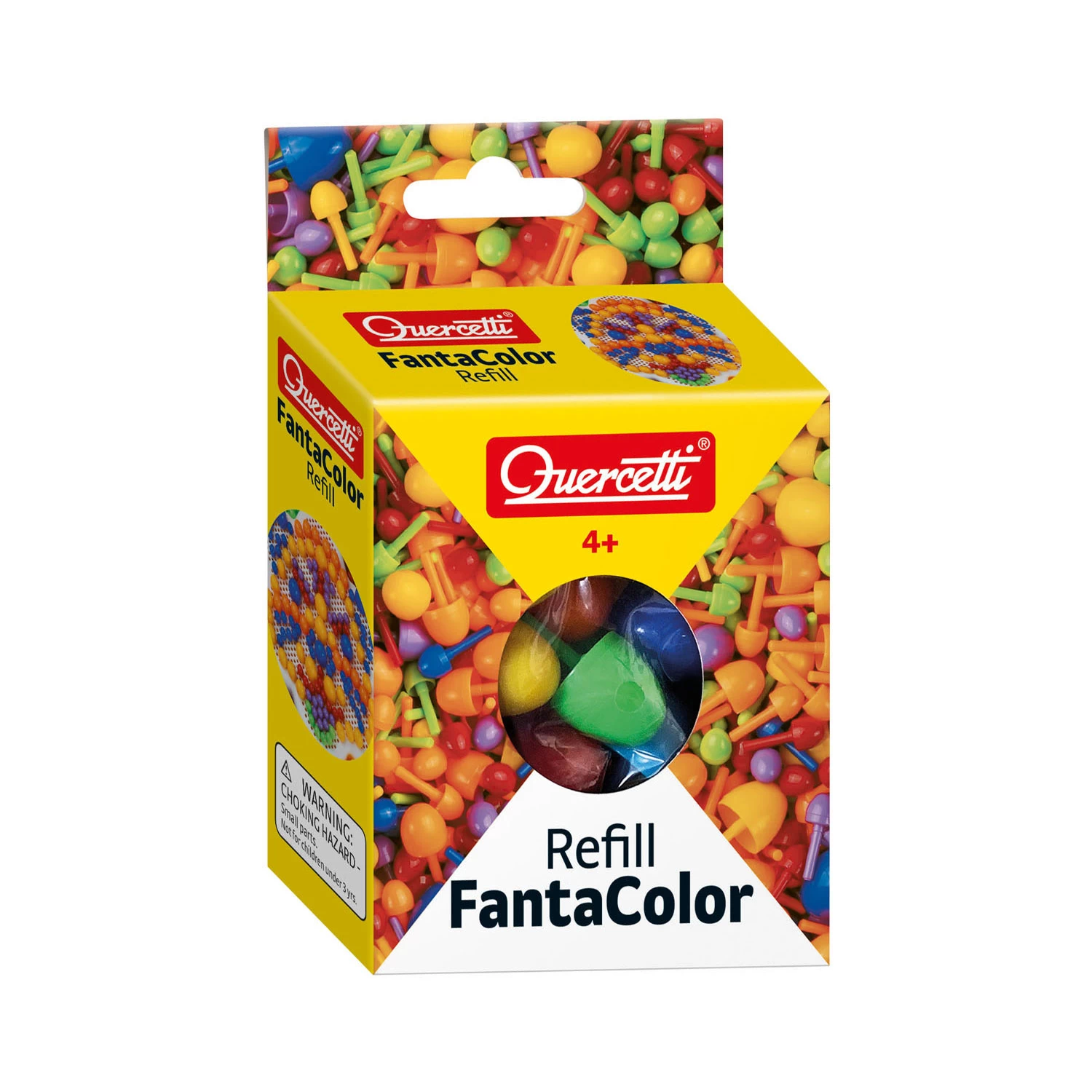 Quercetti Fanatacolor Refill. Met deze aanvuldoos van 36 pinnen heb je er weer meer dan genoeg! De pinnen hebben verschillende kleuren en een diameter van 20 mm.