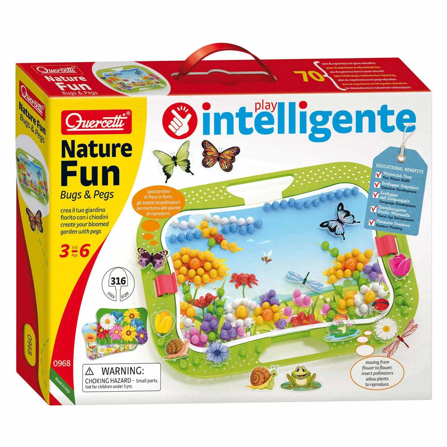 De klassieke Quercetti-knijpers in een kleurrijke versie van de wereld der natuur. Het speelgoed bevat pinnen van verschillende kleuren en diameters die in verschillende scènes van natuurlandschappen kunnen worden gestoken, en tal van stickers en vormen van vlinders, libellen en lieveheersbeestjes om een natuurlijke omgeving na te bootsen.