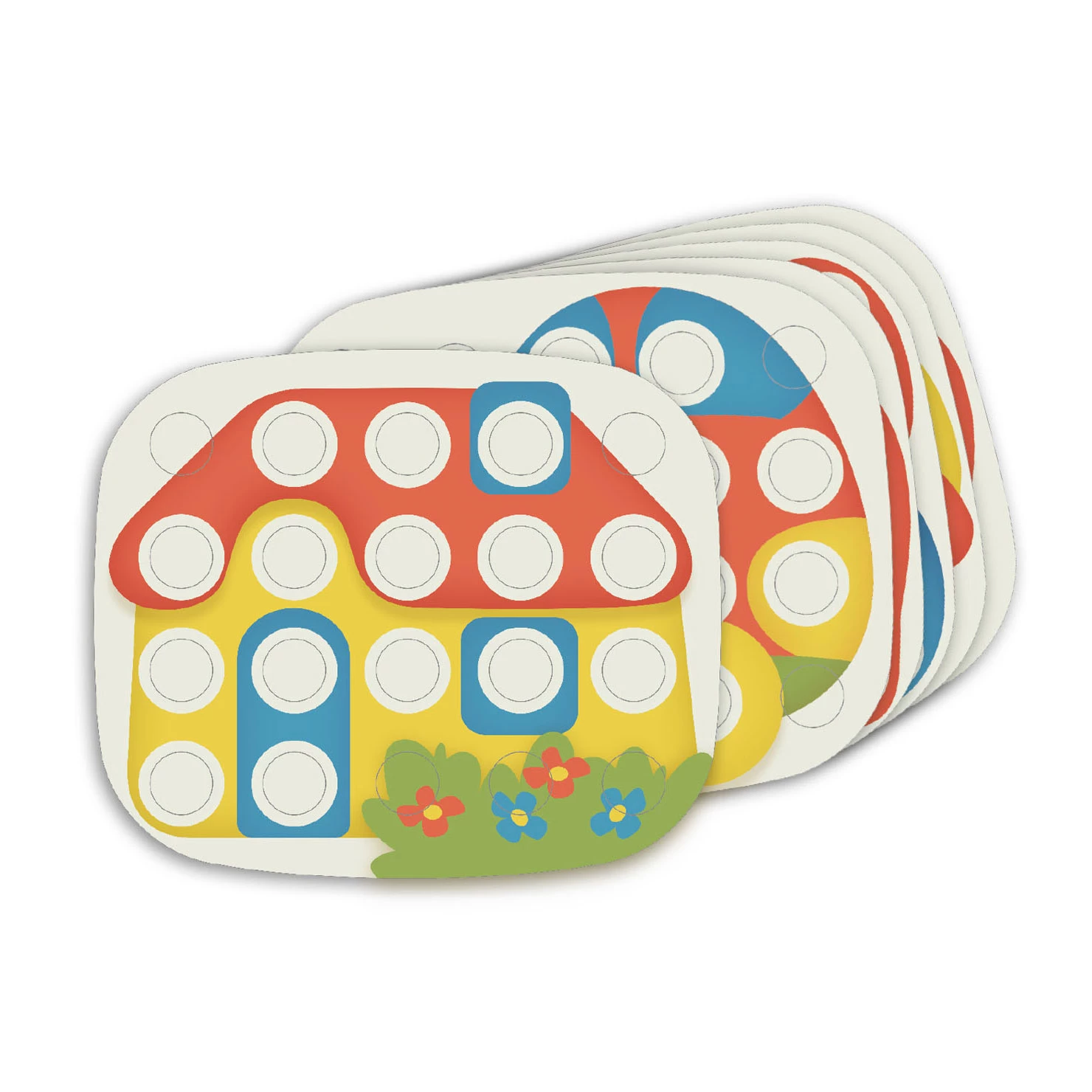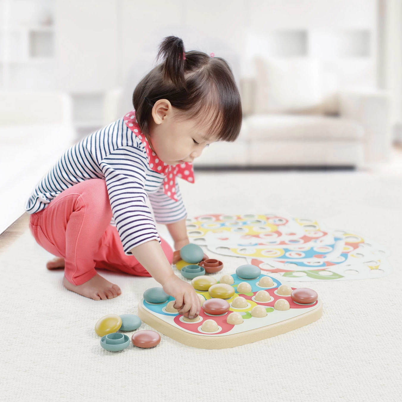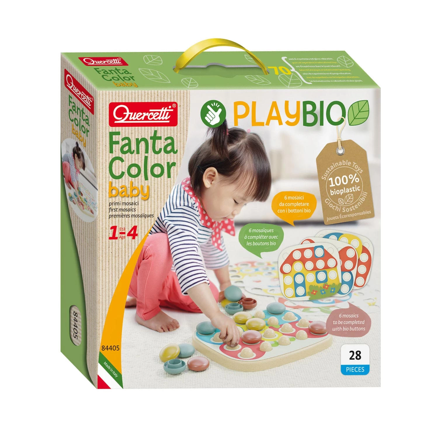 Met dit nieuwe Fantacolor spel van Quercetti kunnen baby’s en peuters zelf mozaïeken maken met de kleurrijke knoppen. De extra grote ronde knoppen zijn speciaal ontworpen voor kleine kinderhandjes. Op het bord kunnen zes verschillende illustraties gelegd worden. De knoppen en illustraties kunnen opgeborgen worden in de meegeleverde hoes. De Play Bio-lijn is gemaakt van bio-composiet. Dit materiaal is milieuvriendelijk en het bio-plastic is 100% recyclebaar. Geschikt vanaf 1 jaar.