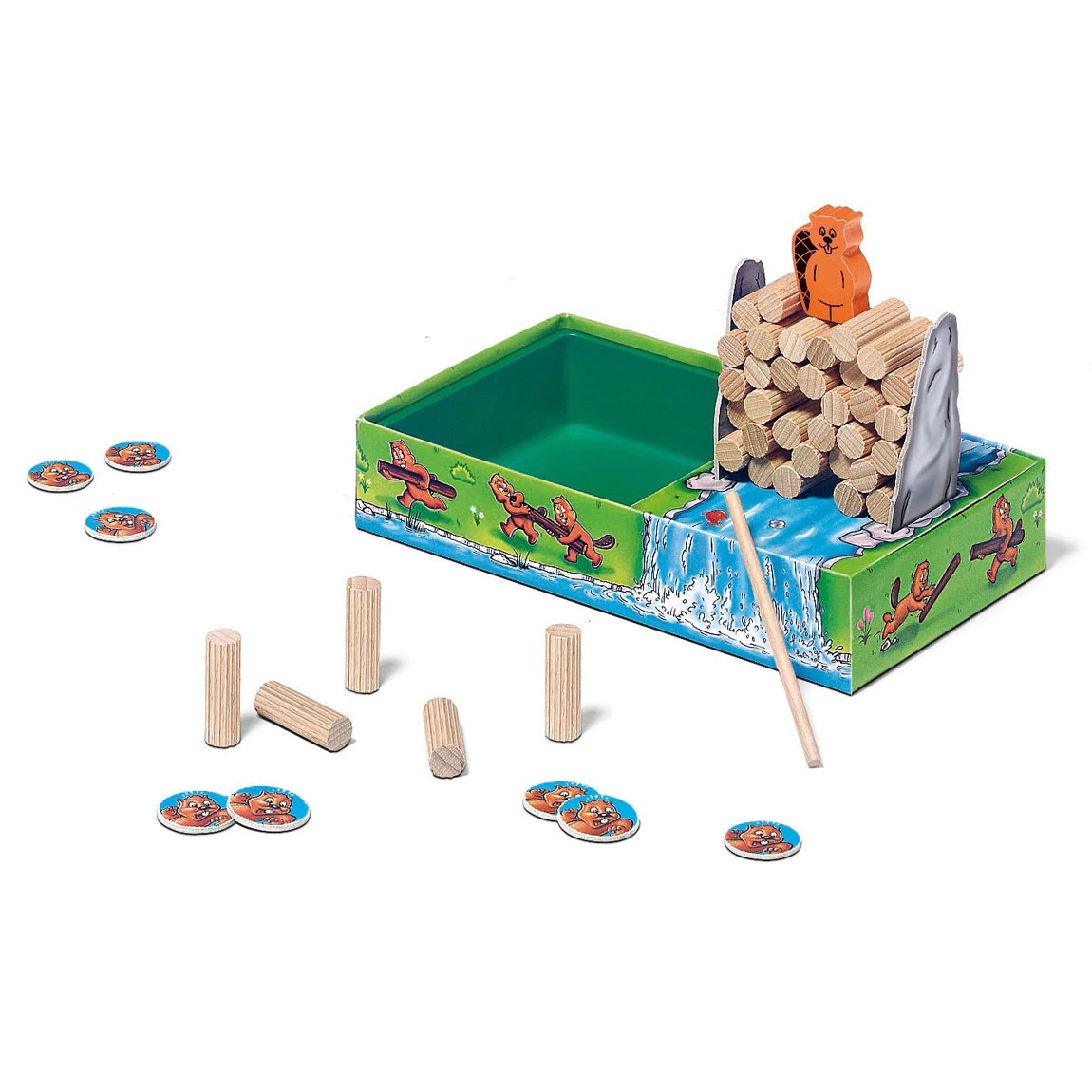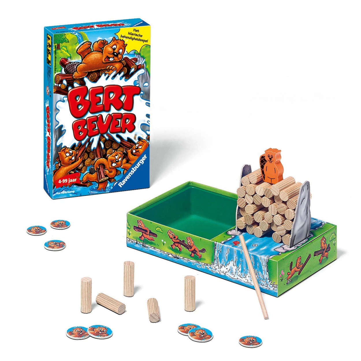 Bert, pas op! Steeds weer schuiven de brutale beverkinderen boomstammen uit de stapel. Soms lukt het, maar als Bert het merkt, moeten er fiches betaald worden. Wie maakt de meeste boomstammen ongemerkt buit? Geschikt voor 1-4 spelers vanaf 4 jaar.