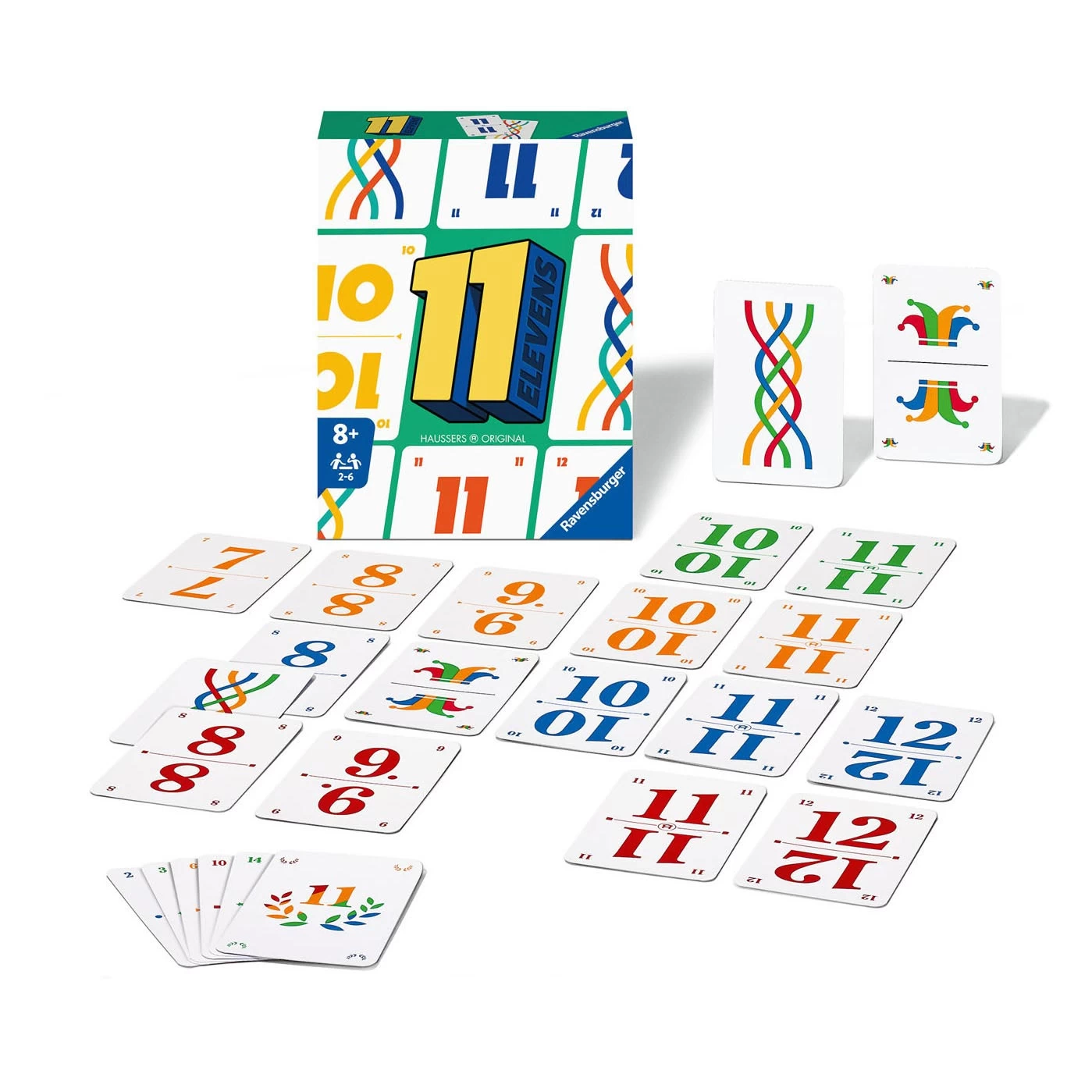 Elevens Het populaire kaartspel voor de hele familie met eenvoudige regels. Getallenkaarten slim aanleggen, brugkaarten en jokers doelbewust gebruiken en bonuspunten incasseren! Spanning en afwisseling tot de laatste kaart – want aan het eind wint de speler met de meeste punten.