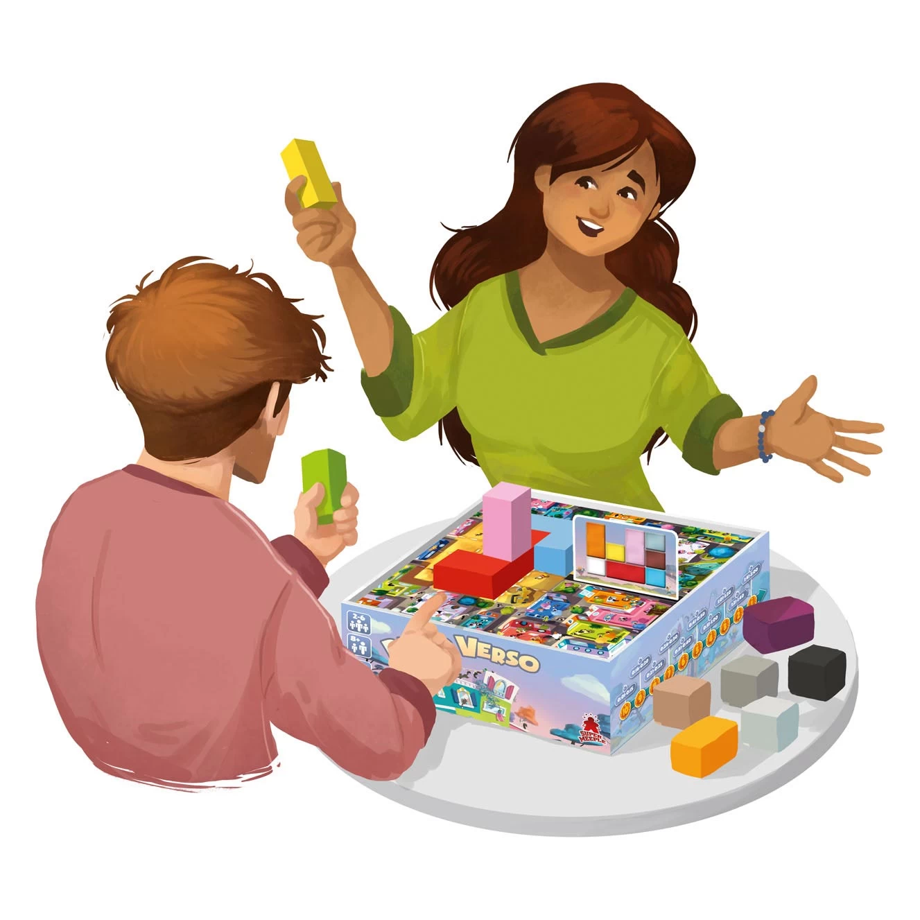 In Recto Verso (winnaar Speelgoed van het Jaar ’22 BE) ga je de uitdaging aan om als een architectenduo samen zo snel mogelijk een huis te bouwen. Twee spelers gaan tegenover elkaar zitten en proberen de constructie op de uitdagingskaart te maken door middel van gekleurde houten blokken. Hoewel het gezamenlijke bouwwerk dezelfde contour deelt, verschilt de invulling aan de voor- en achterkant. Aangezien iedere speler enkel maar naar zijn kant van de kaart mag kijken, is communicatie van belang. Alleen door voortdurend met elkaar te overleggen kunnen de spelers ervoor zorgen dat elk gekleurd blokje op de juiste plaats terechtkomt. Terwijl ze tegen de klok racen! Hoe sneller de spelers hun gebouw voltooien, hoe meer punten ze scoren. Een leuk spel voor jong en oud dat je ruimtelijk inzicht en communicatievaardigheden zal vereisen.