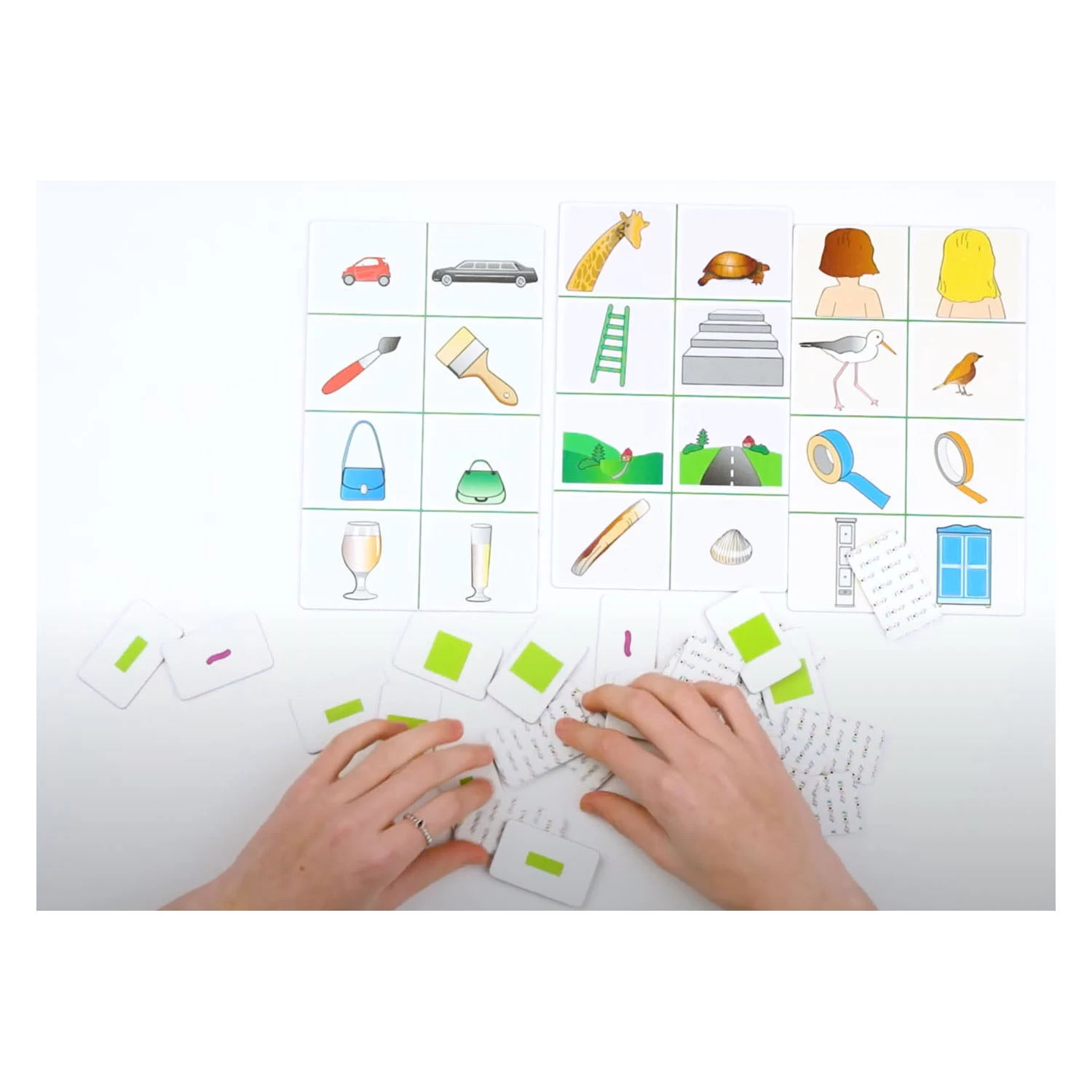Is het kort, lang, breed of smal? Dat is de vraag die kinderen zichzelf stellen bij elk van de plaatjes van het spel. Een leuk en uitdagend spel waarbij ze de geometrische concepten van maatvoering meekrijgen. Het spel bestaat 6 opdrachtkaarten van 20 x 12 cm en 48 kaartjes 3 x 5 cm. Je speelt dit spel met 6 kinderen vanaf 5 jaar.