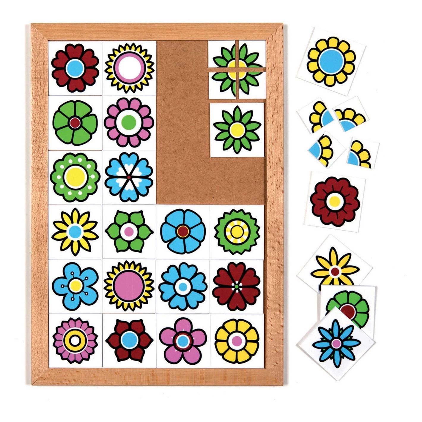 Maak van twee halve bloemen een hele. Maar let goed op dat je wel de juiste stukjes samenvoegt. Een lottospel leert kinderen wat wel en wat niet bij elkaar hoort. Het bloemenlotto van Rolf Bestaat uit 48 ‘halve’ plaatjes, formaat 3 6 cm, die samengevoegd een geheel vormen. Daarvoor moet je wel de juiste combinaties vinden. Dat is helemaal niet zo makkelijk, want de bloemen lijken erg op elkaaar. Goed kijken en vergelijken dus! Dit spel is bedoeld voor kinderen vanaf 3 jaar.