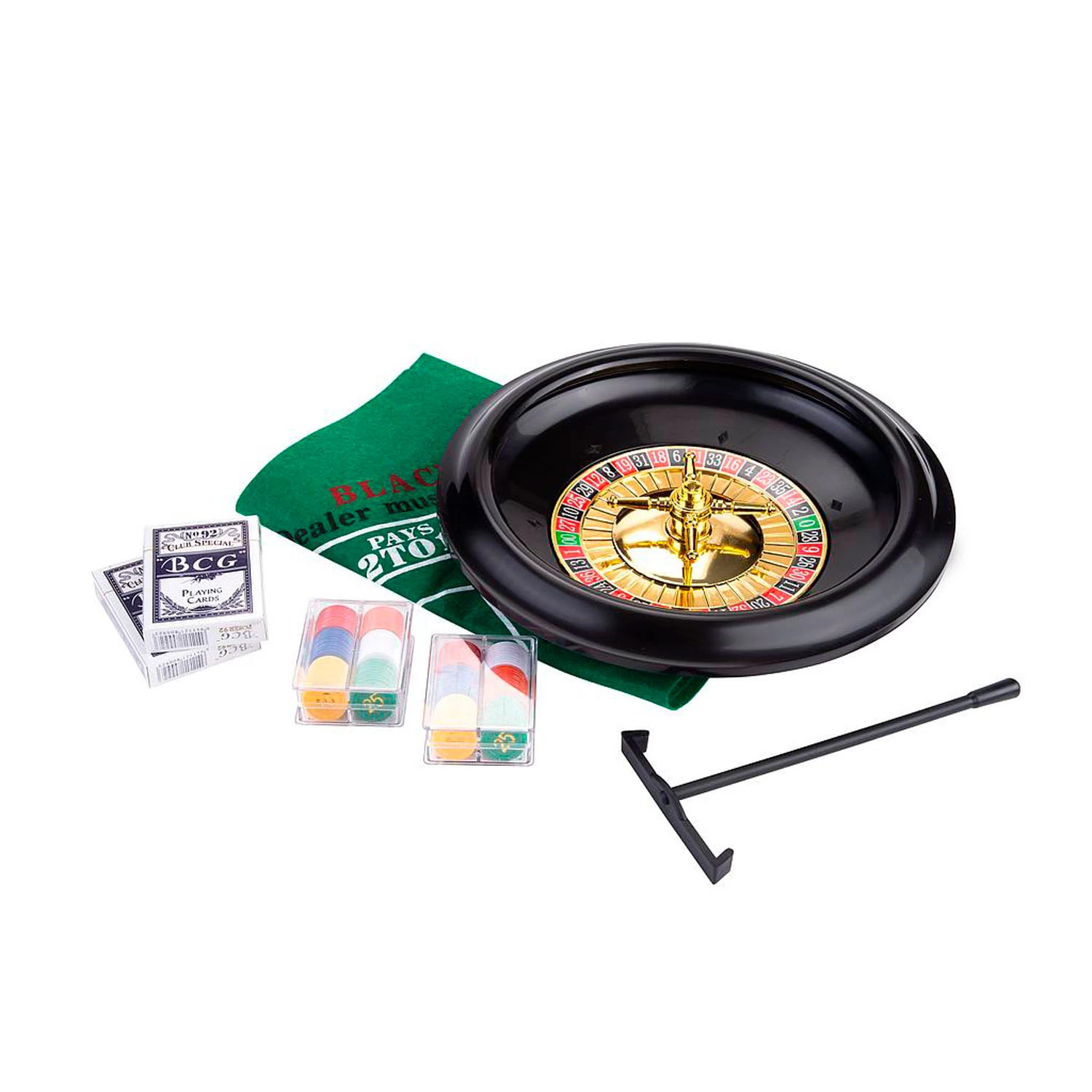 Kunststof roulettebak met diameter van 30cm. Compleet met roulettekleed (60x45cm) , harkje en fiches. Gebasseerd op Amerikaans roulette, dus met dubbel 00. Achterkant van het kleed is black jack inclusief kaarten.