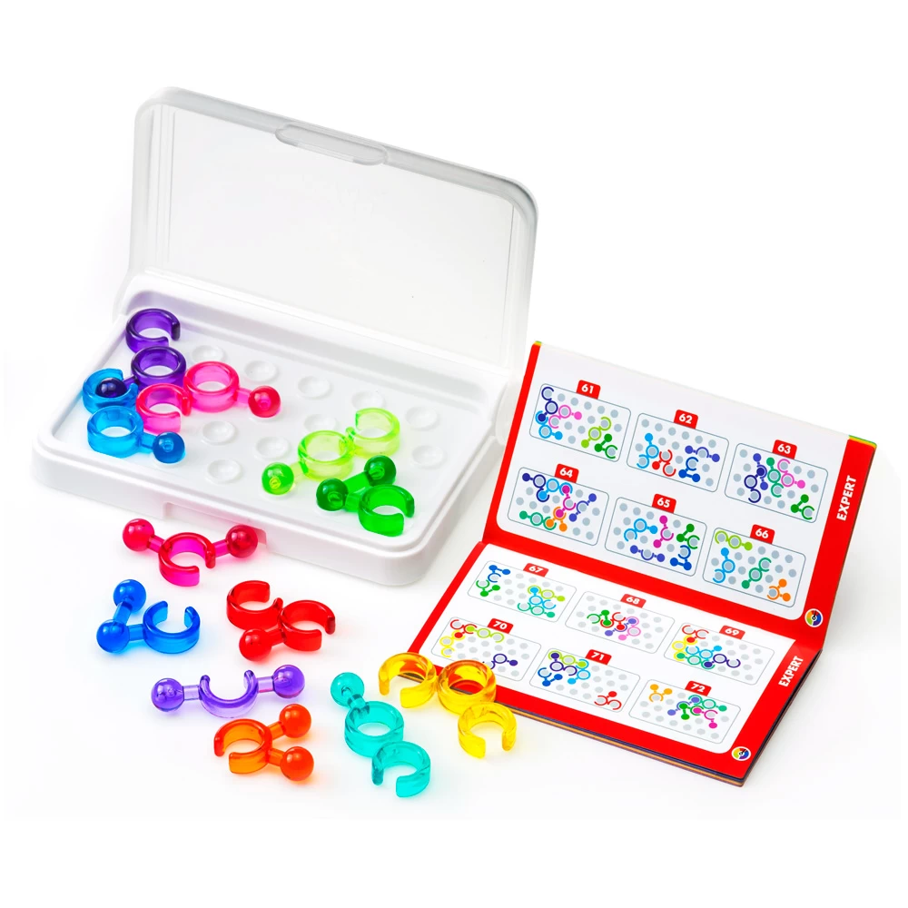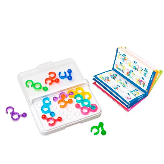 Ga slim te werk en pas alle puzzelstukken op het spelbord. Maar let op! Er zijn 36 puzzelonderdelen maar slechts 24 plaatsen op het bord! Open ringen en bollen van verschillende puzzelstukken kunnen op dezelfde plaats gelegd worden. Maar enkel wanneer je ze op de juiste manier aan elkaar linkt. IQ-Link is een compact reisspel en het meest uitdagende denkspel in de reeks IQ-puzzels van SmartGames. Bovendien ogen de gekleurde, doorzichtige puzzelstukken fantastisch. Inhoud: 12 kleurrijke puzzelstukken, compact spelbord met transparant deksel, boekje met 120 opdrachten.