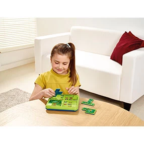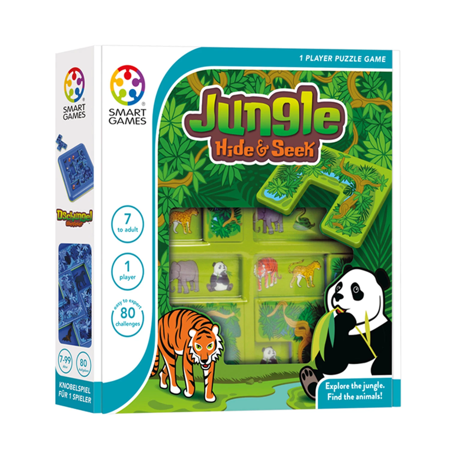 Ontdek een nieuwe wereld met jungle dieren! Kan jij de juiste Aziatische jungle dieren vinden die in je opdracht staan en zo ook al de anderen verbergen? Met 80 opdrachten en een dubbelzijdig spelbord is Jungle Hide & Seek zoals 2 spellen in 1. Het spelbord van de dag kant (groen) bestaat uit 4 aparte delen maar de nacht kant (blauw) slechts uit 1 deel hetgeen moeilijkere opdrachten met zich meebrengt.