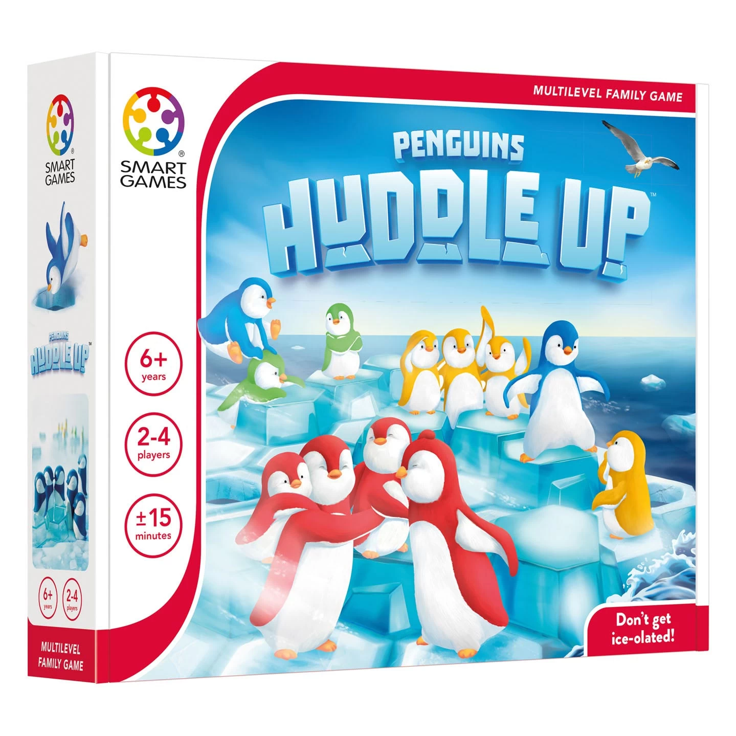 De ijzige poolnacht komt eraan en de pinguïns zitten nog verspreid over het ijs. Breng jouw pinguïns samen in één hechte groep, springend of glijdend over het ijs. De speler die als eerste zijn hele pinguïnfamilie verenigt, wint het spel. Inhoud: 1spelbord, 4 pinguïnfamilies in verschillende kleuren (elke pinguïnfamilie bestaat uit 3 grote en 3 kleine pinguïns), 6 ijsblokken (4 rechte ijsblokken en 2 gebogen ijsblokken)