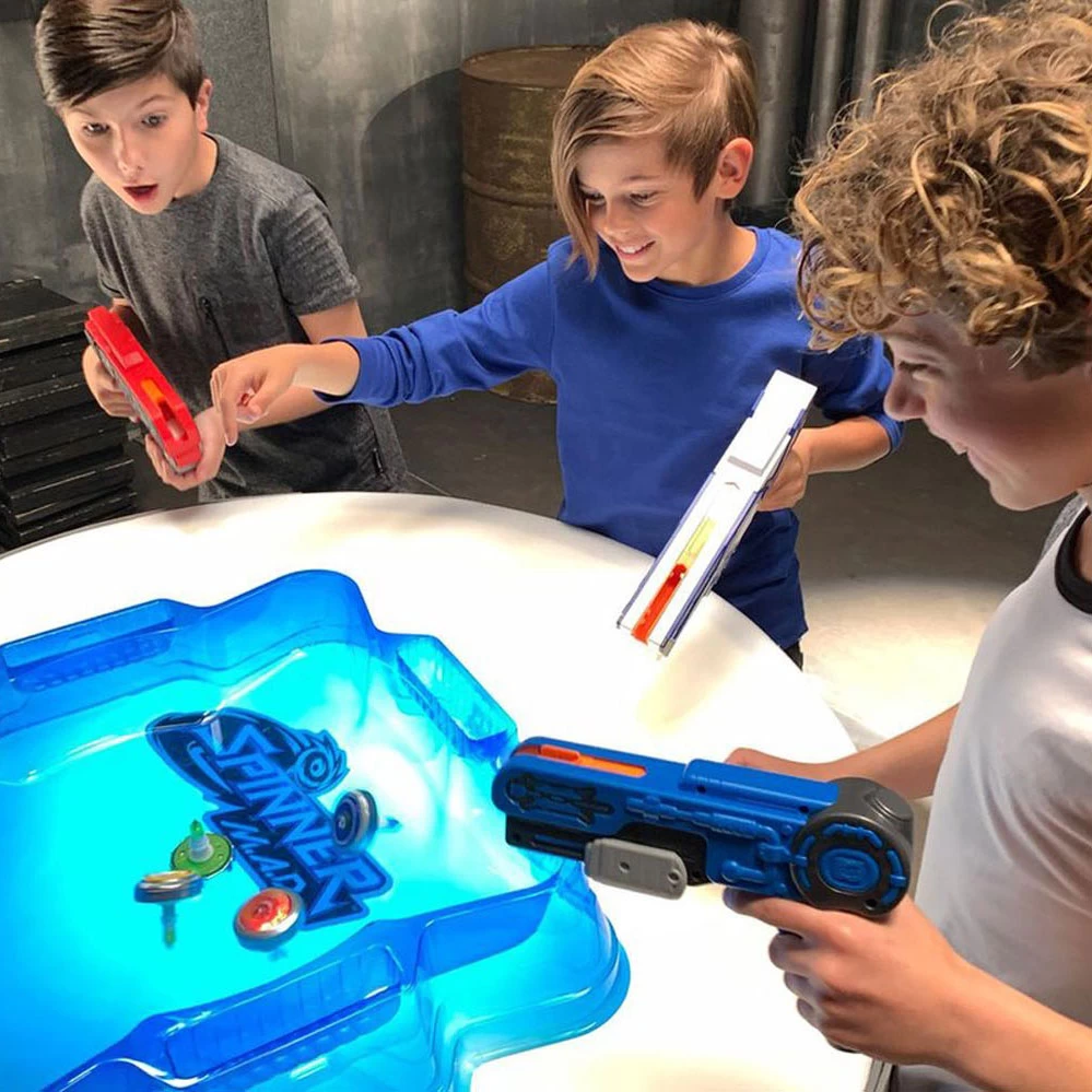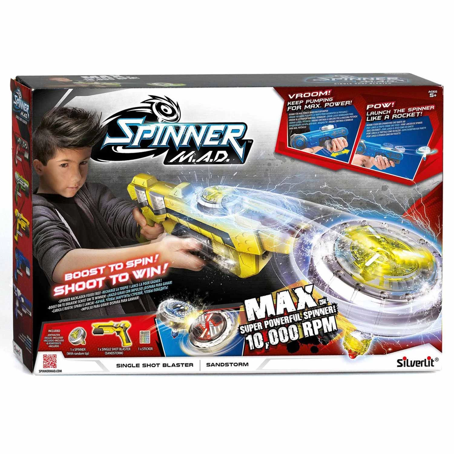 Spinner Mad is een spannend Battle Actiespel! Plaats de spinner op je blaster, gebruik de power booster om je spinner op te laden en… schiet! Laat jouw spinner zo lang mogelijk draaien! Battle met vrienden en zie hoe de spinners elkaar proberen omver te stoten terwijl ze stoere stootgeluiden laten horen. Degene van wie de spinner het langst blijft staan, is de winnaar! Dit actiespel is iedere keer weer spannend en sensationeel. Geen batterijen nodig, ready to play. Spinner Mad: Boost to spin, Shoot to win! Deze set bestaat uit 1 gele Blaster Sandstorm en 1 spinner. Leeftijdsindicatie: 5 jaar+. Afmeting verpakking: 32x6x22cm (lxbxh)
