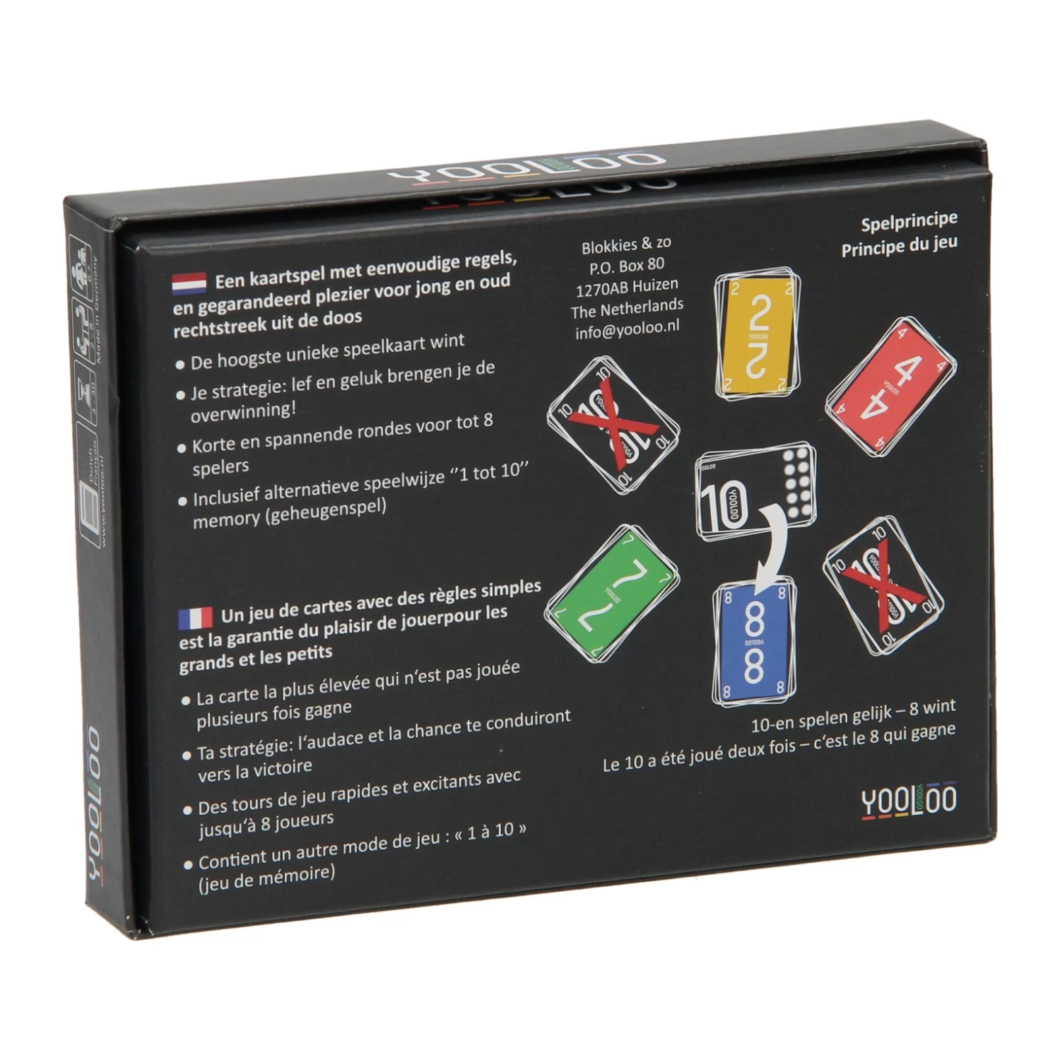 YOOLOO draait om plezier, eenvoudige regels en snelle rondes, met een hoge verslavings- en opwindingsfactor die onmiddellijk plezier garandeert voor jong en oud (aanbevolen voor kinderen vanaf 6 jaar). Dit spel kan worden gespeeld met 2 tot 8 spelers uit je familie of vriendengroep, waarbij geluk en tactiek samenkomen om zoveel mogelijk punten te scoren. De hoogste speelkaart in elke ronde wint de puntenkaart, maar wees gewaarschuwd: als een kaart wordt verdubbeld, wordt deze uit de score verwijderd. In de doos vind je 90 speelkaarten en een set instructies in zowel het Nederlands als het Frans. Een spel vol plezier voor 2 tot 8 spelers vanaf 6 jaar.